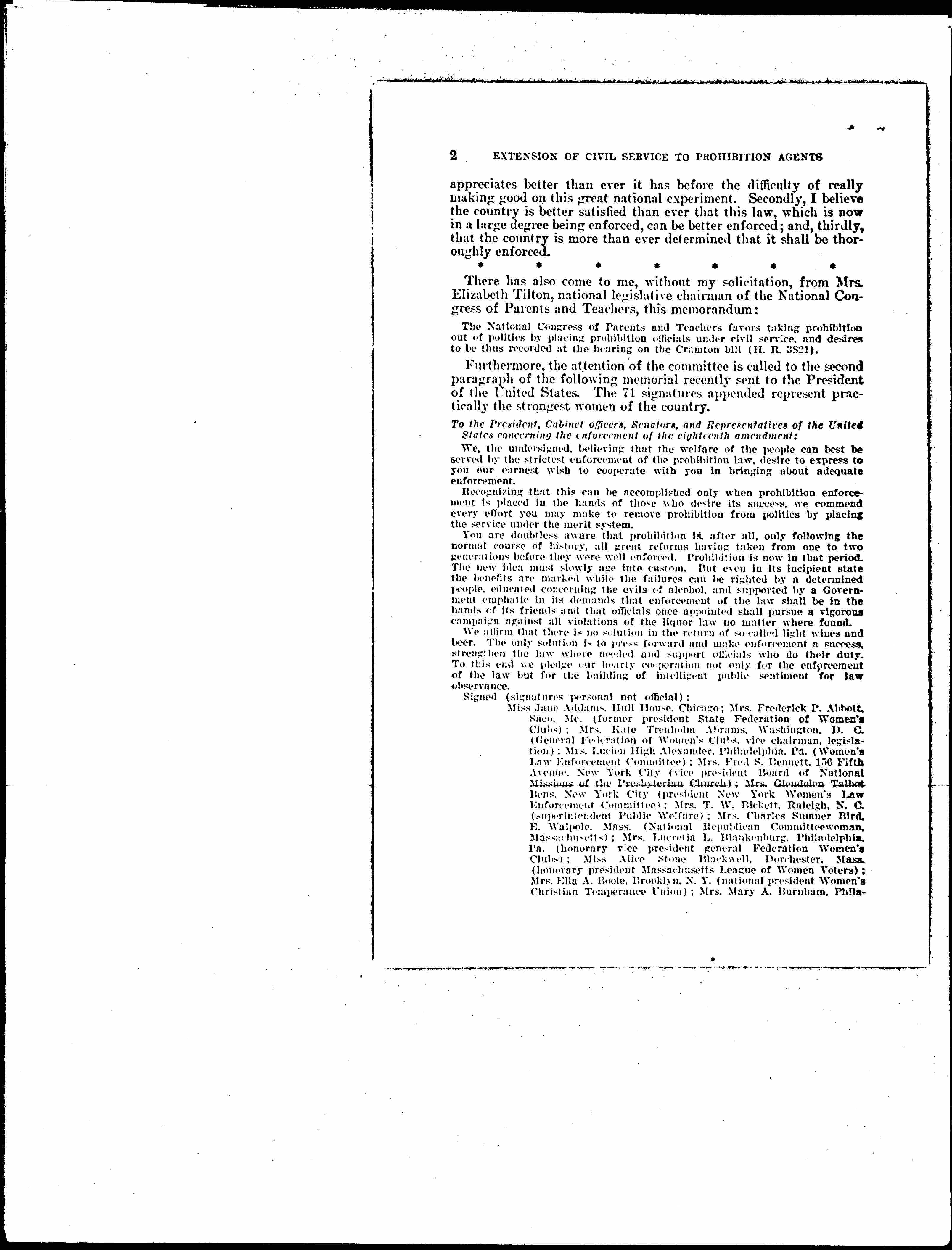Furthermore, the attention of the committee is called to the second paragraph of the following memorial recently sent to the President of the United States. The 71 signatures appended represent practically the strongest women of the country. [see enclosure]