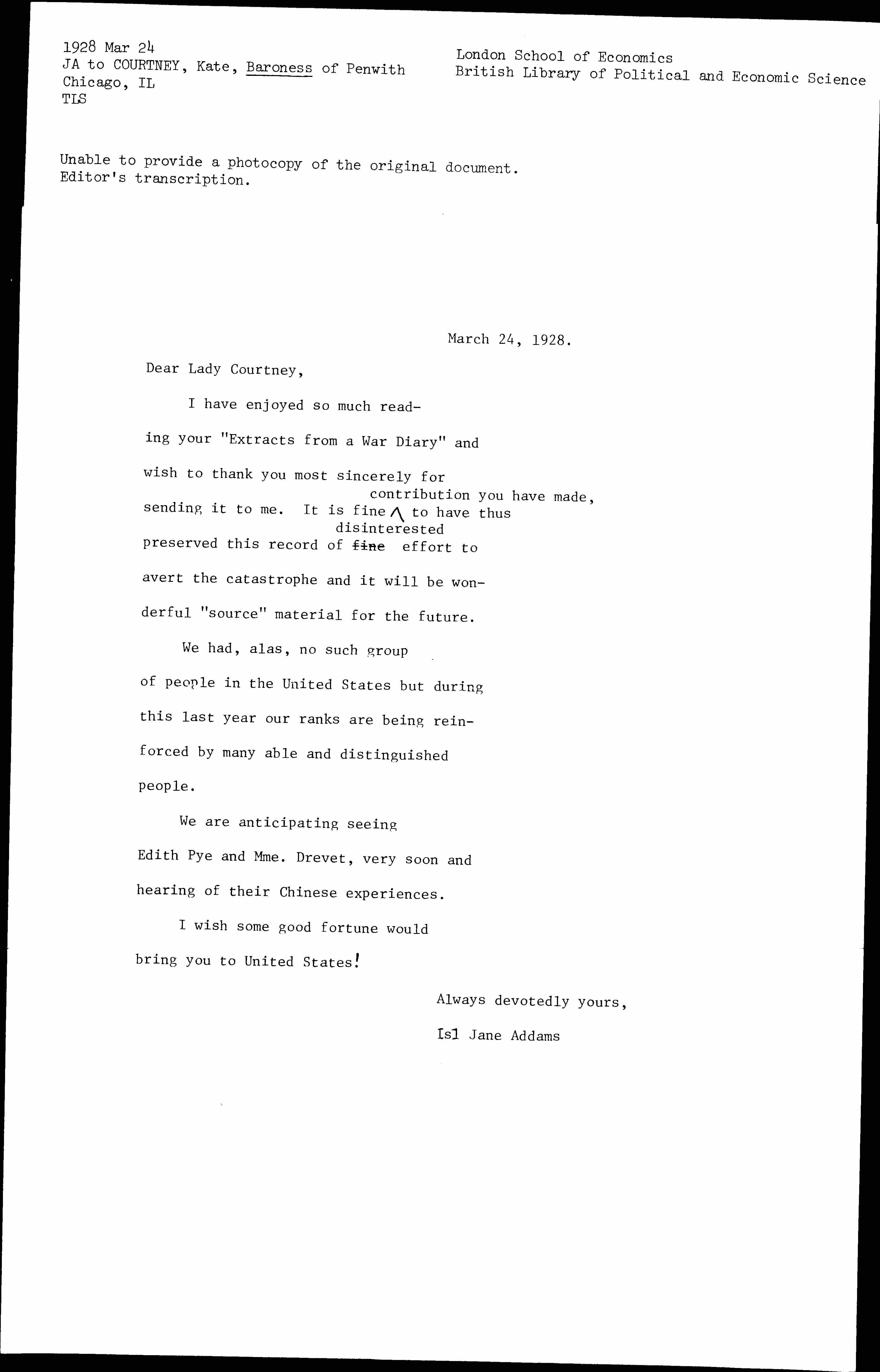 Jane Addams to Catherine Potter Courtney, March 24, 1928