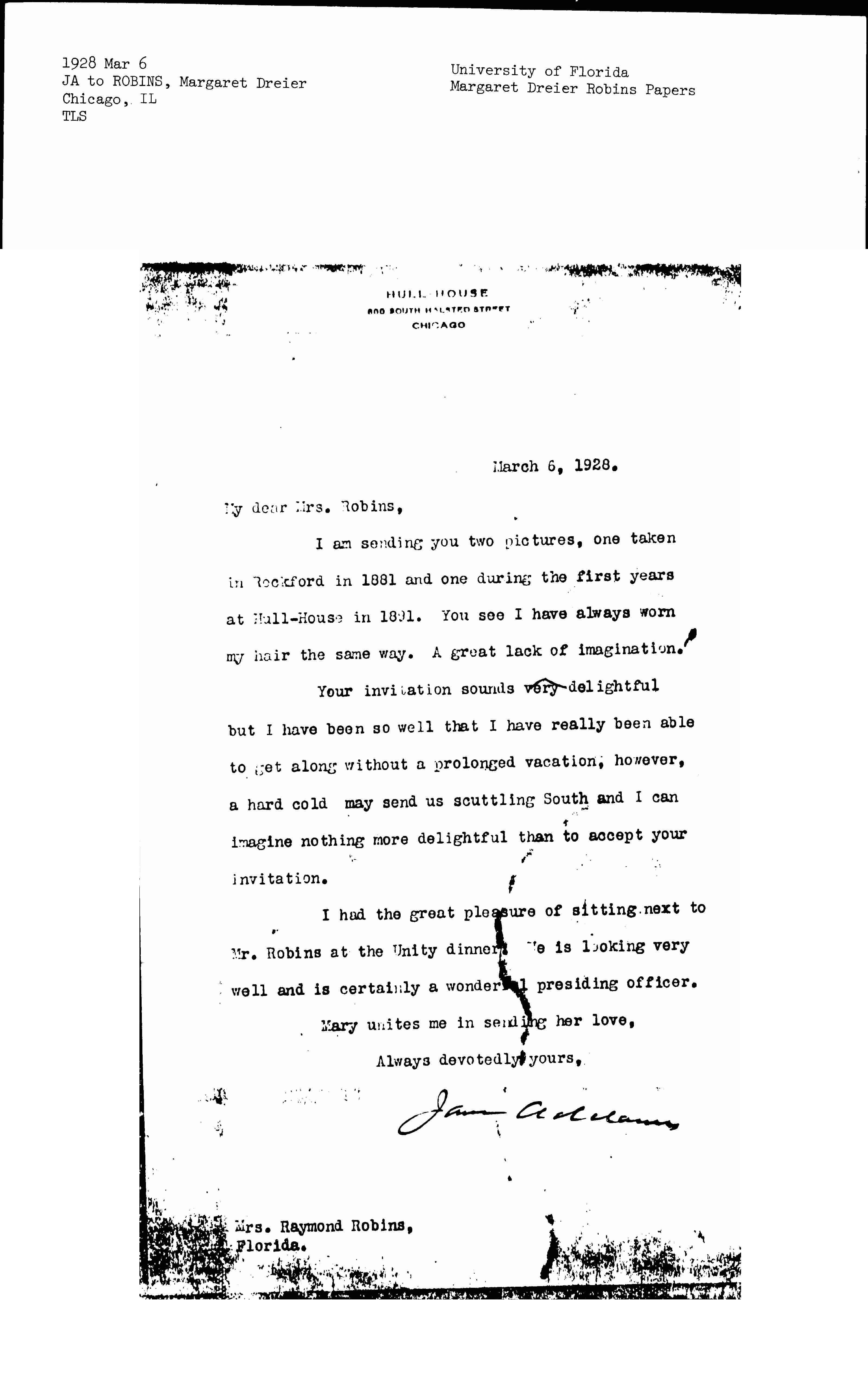 Jane Addams to Margaret Dreier Robins, March 6, 1928