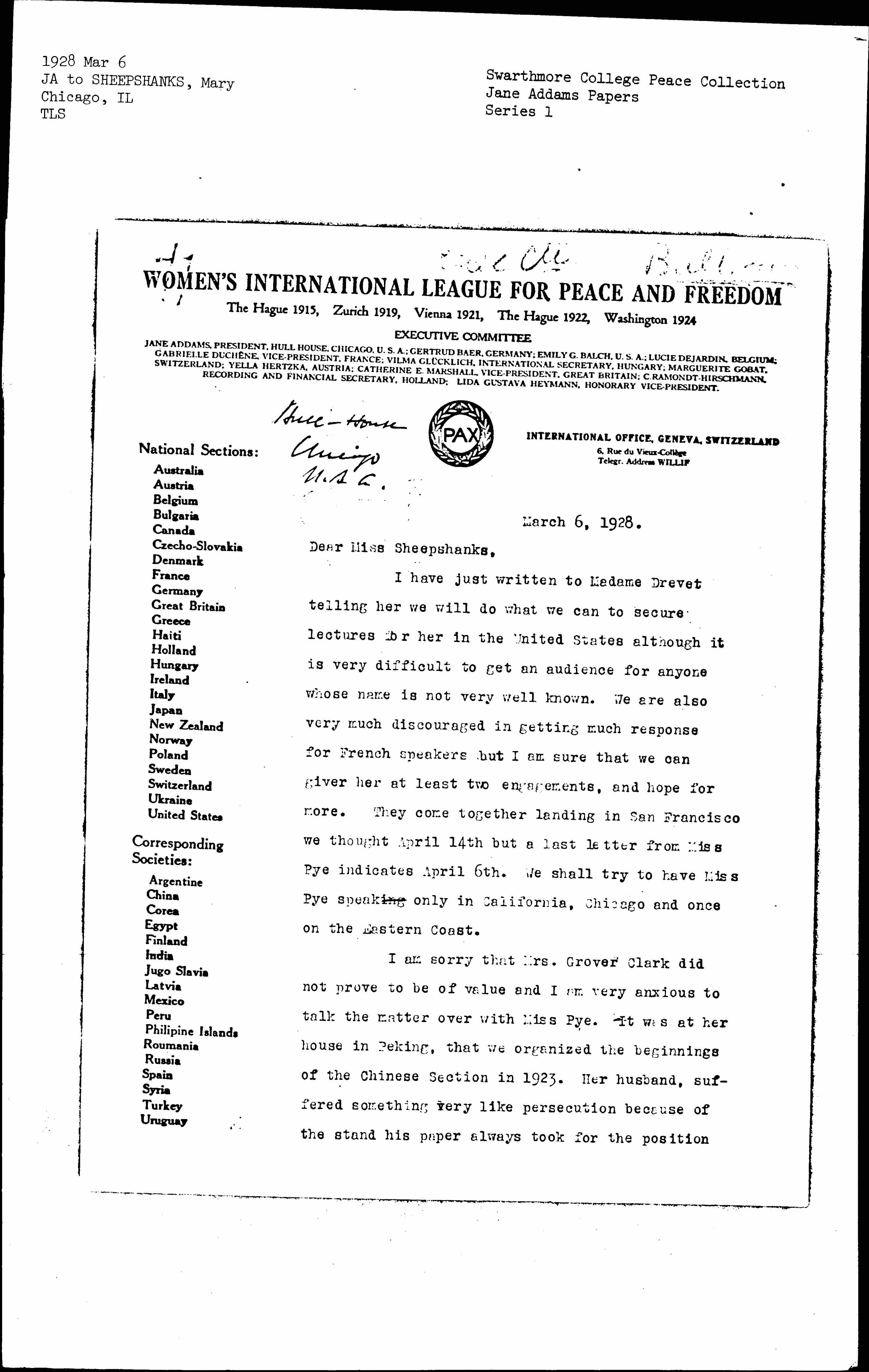 Jane Addams to Mary Ryott Sheepshanks, March 6, 1928