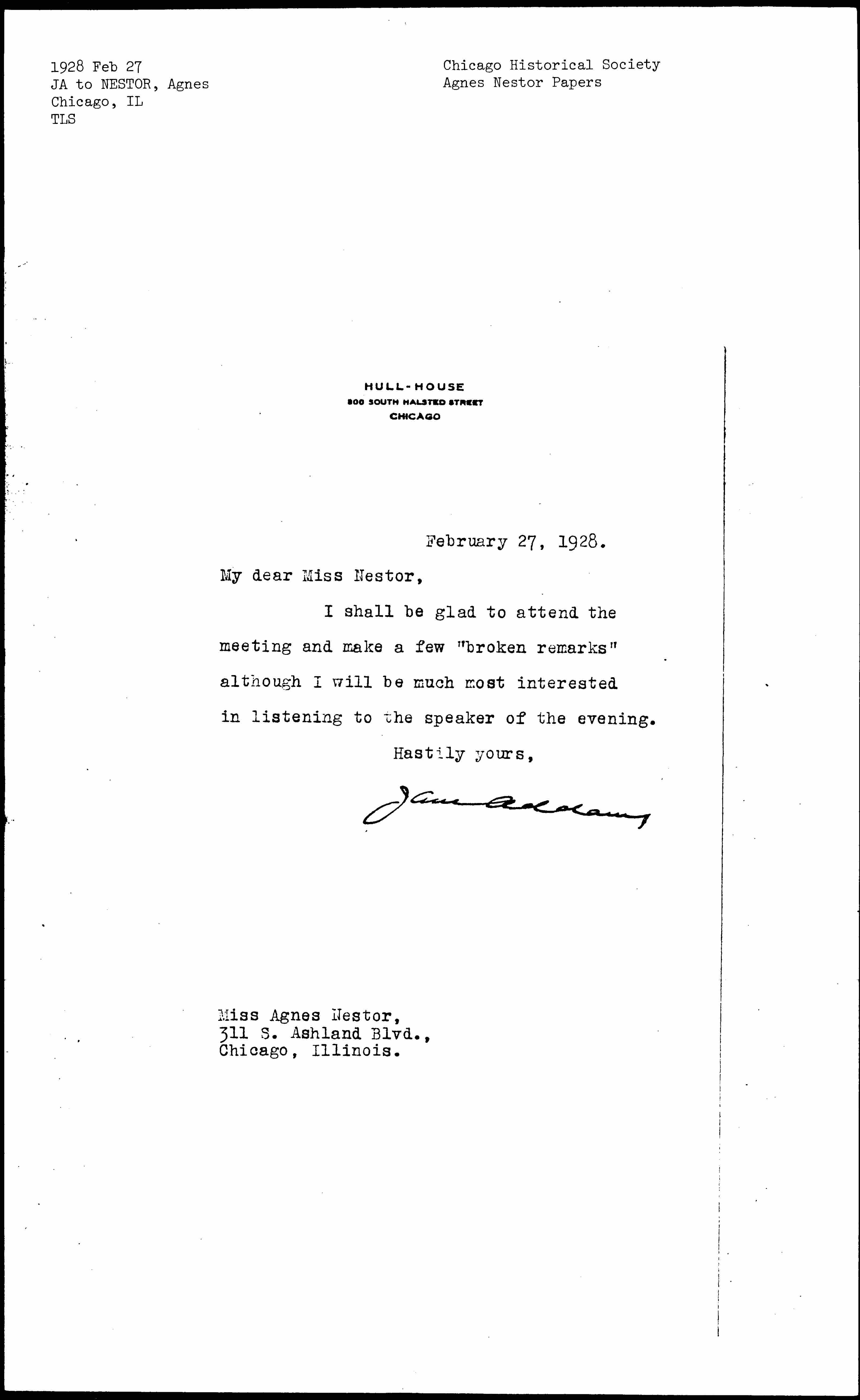 Jane Addams to Agnes Nestor, February 27, 1928
