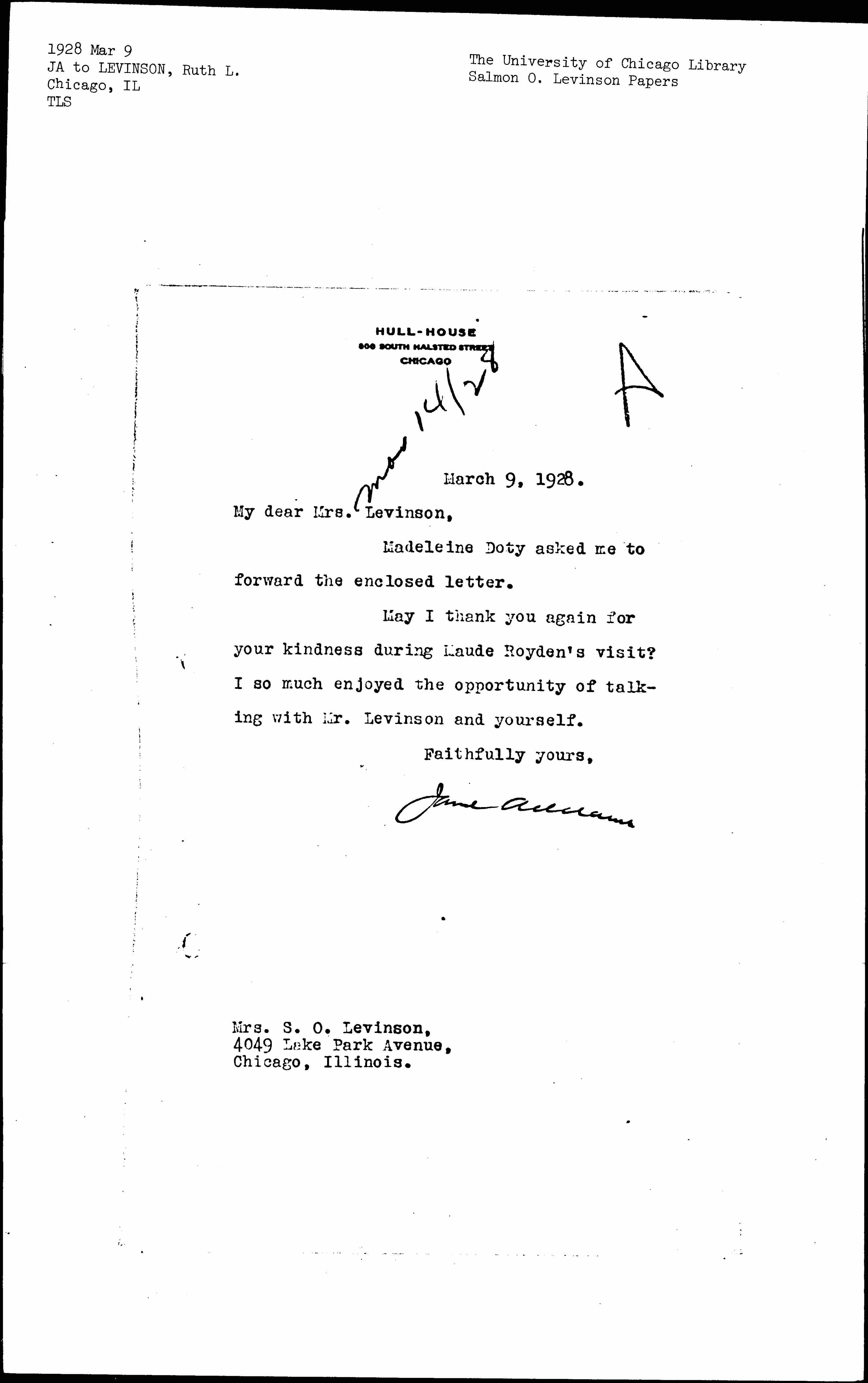 Jane Addams to Ruth Karr Langworthy Levinson, March 9, 1928