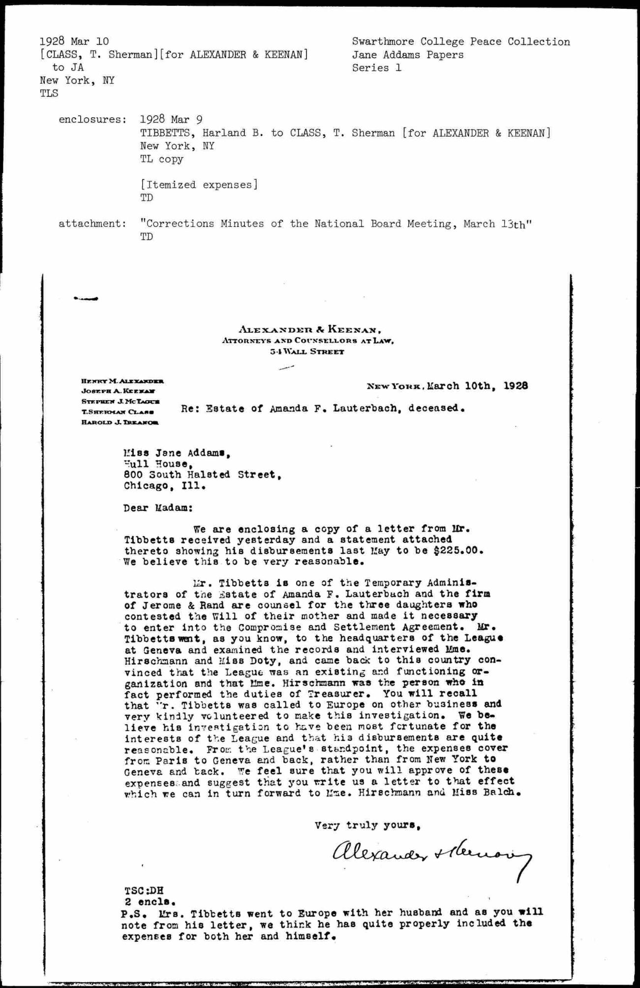 Theodore Sherman Class to Jane Addams, March 10, 1928
