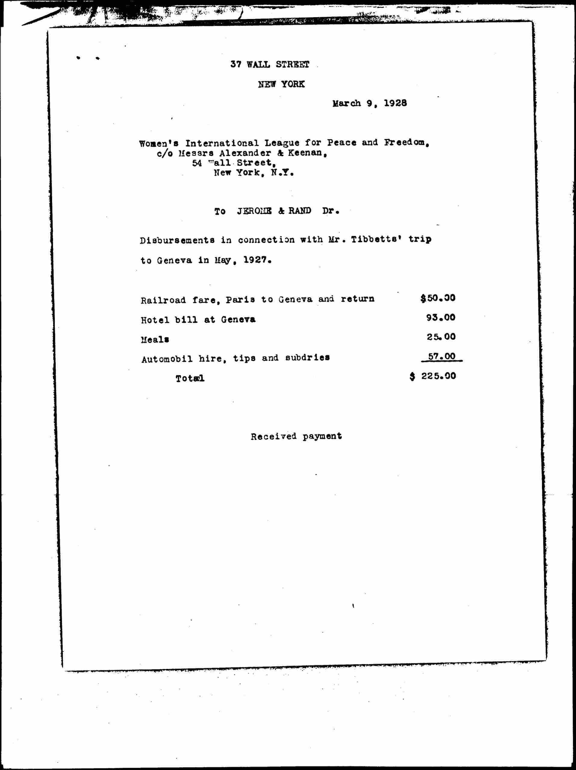 Harland Bryant Tibbetts Itemized Expenses, March 9, 1928