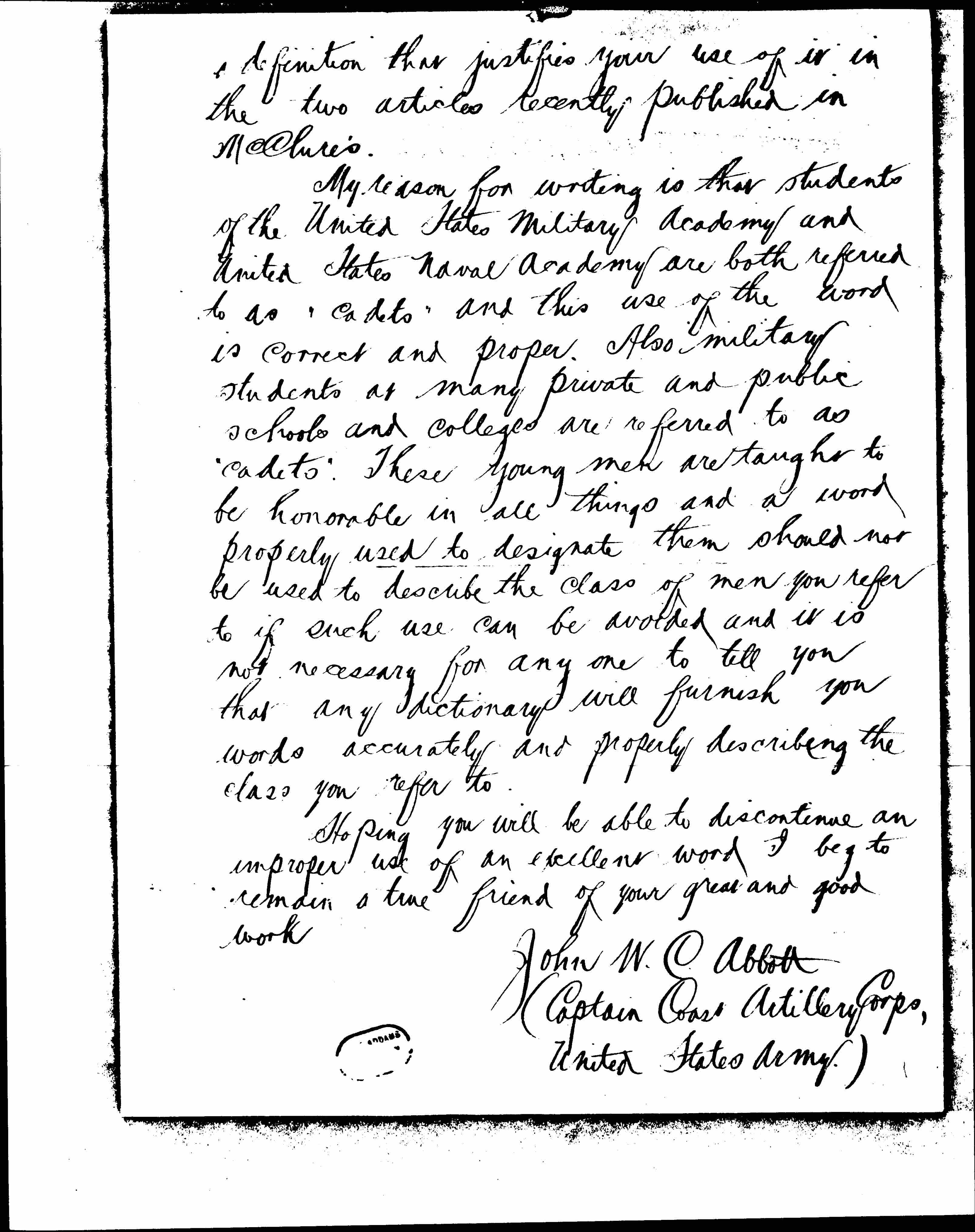 You, along with others, have recently used the word "cadet" to describe men of the lowest type known to civilization. The use of the word in that sense does not seem to be in accordance with the definition as given in the dictionaries. It is found defined in the latest edition of the Encyclopedia Britannica and in the Century Dictionary, these two have just been examined and neither in any way gives to the word [page 2] a definition this justifies your use of it in the two articles recently published in McClure's.