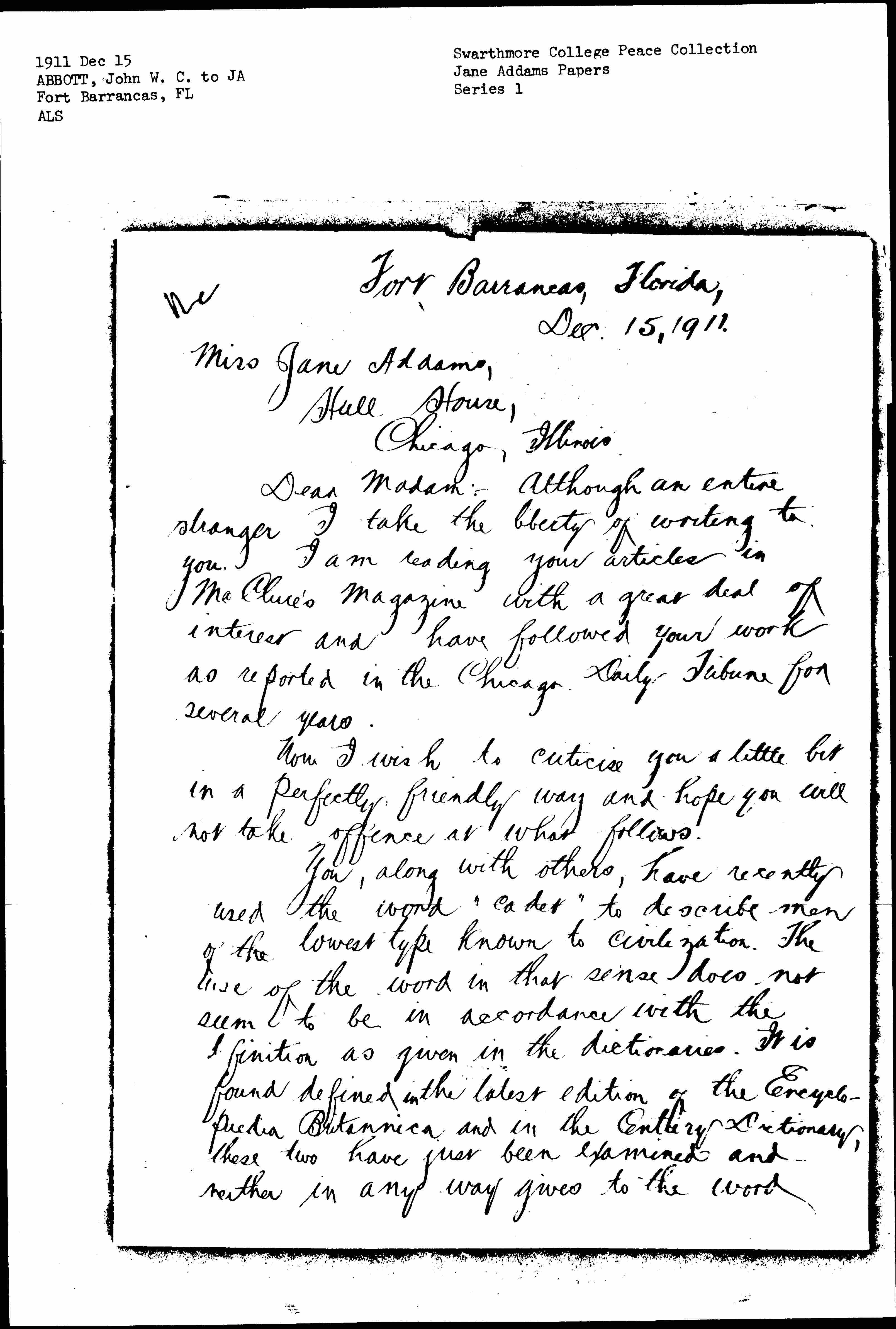 Dear Madam:- Although an entire stranger I take the liberty of writing to you. I am reading your articles in McClure's Magazine with a great deal of interest and have followed your work as reported in the Chicago Daily Tribune for several years.