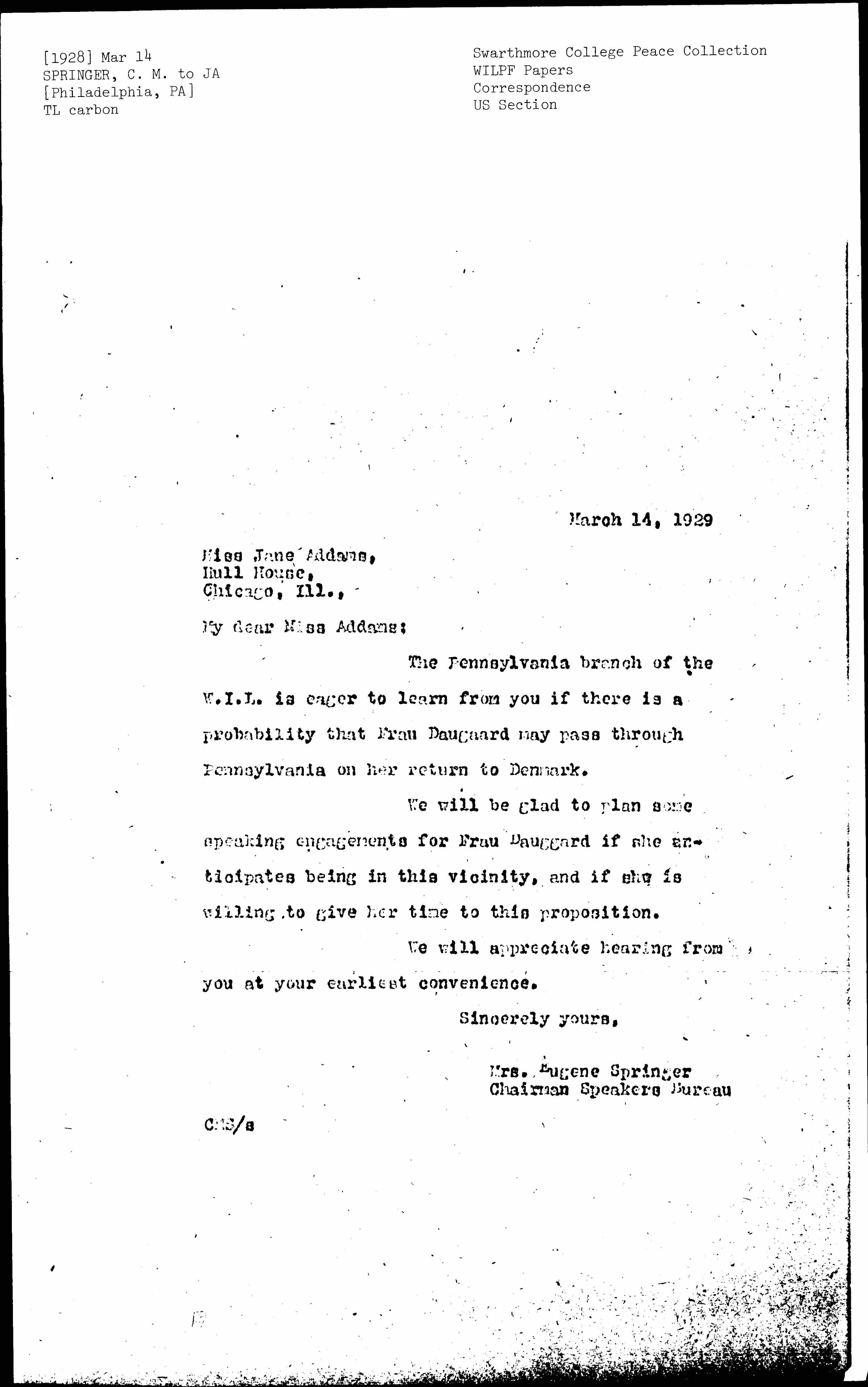 Carrie Mendelsohn Springer to Jane Addams, March 14, 1928