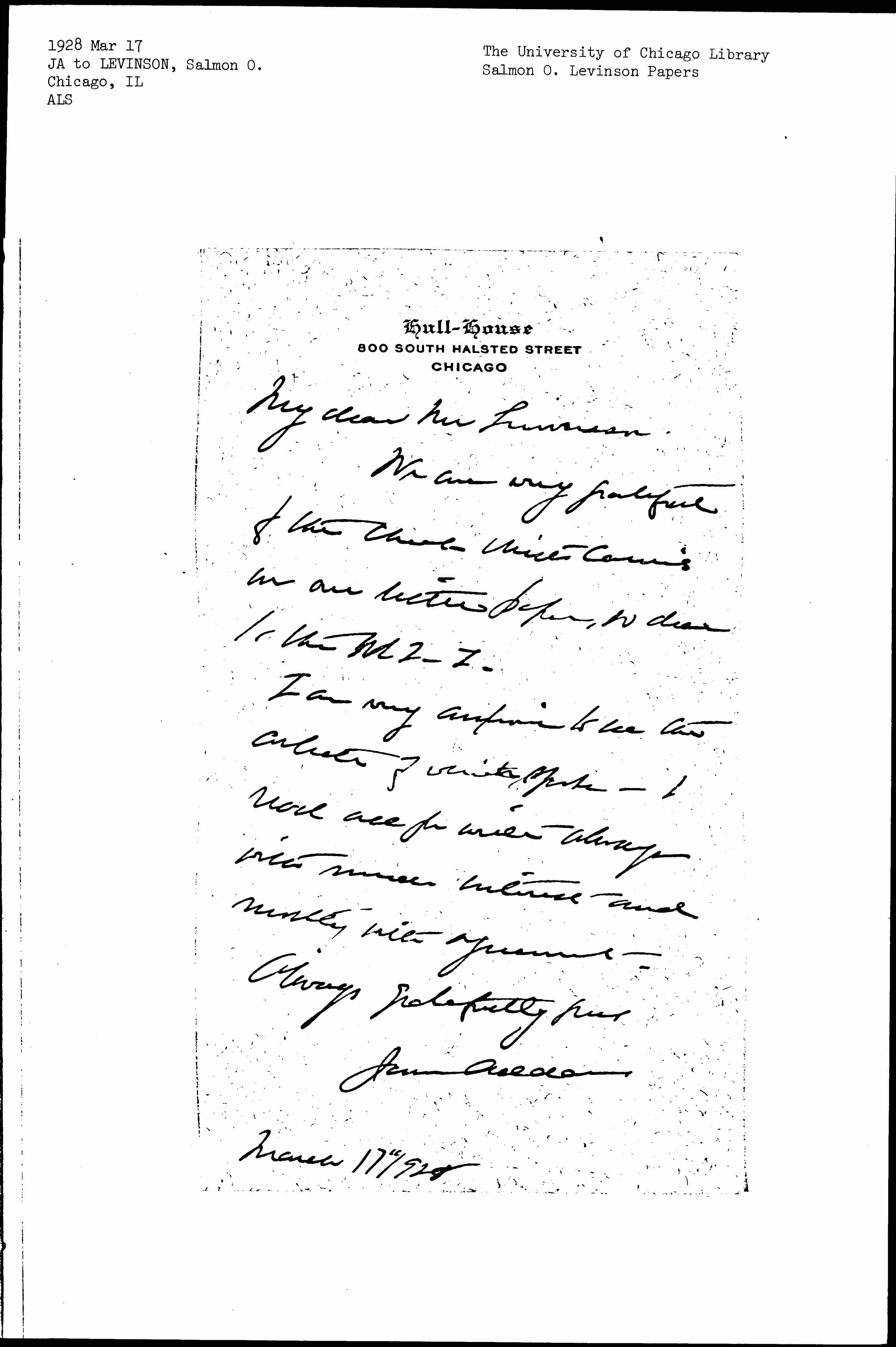 Jane Addams to Salmon Oliver Levinson, March 17, 1928