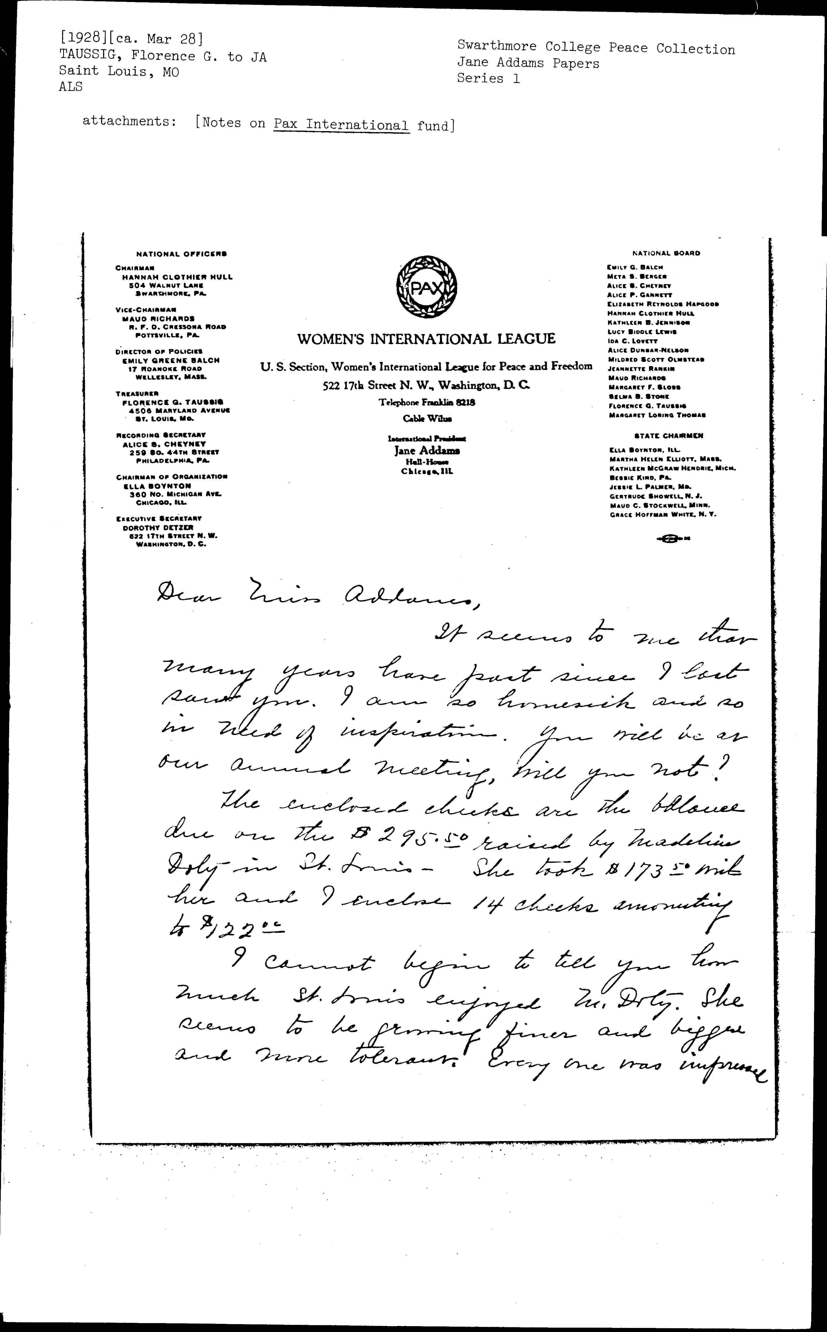 Florence Gottschalk Taussig to Jane Addams, ca. March 28, 1928