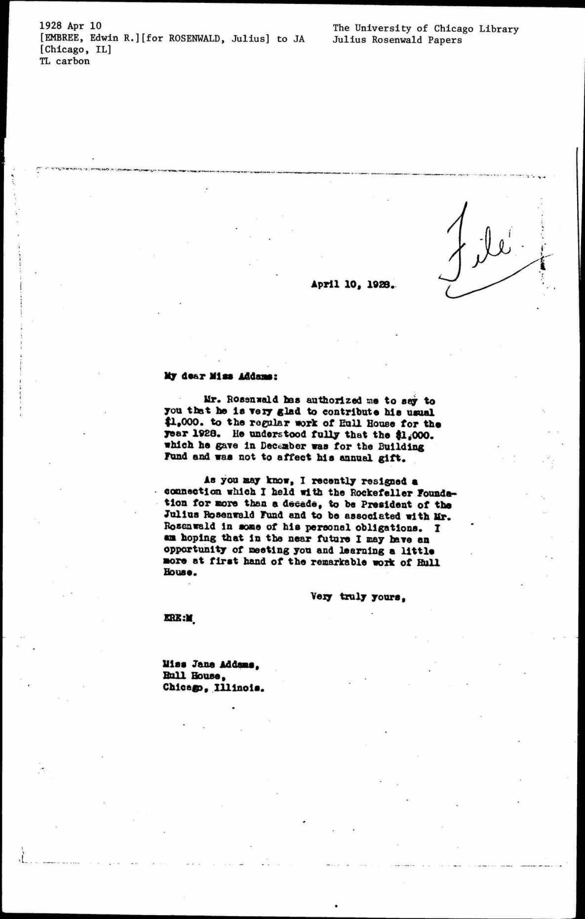 Edwin Rogers Embree to Jane Addams, April 10, 1928