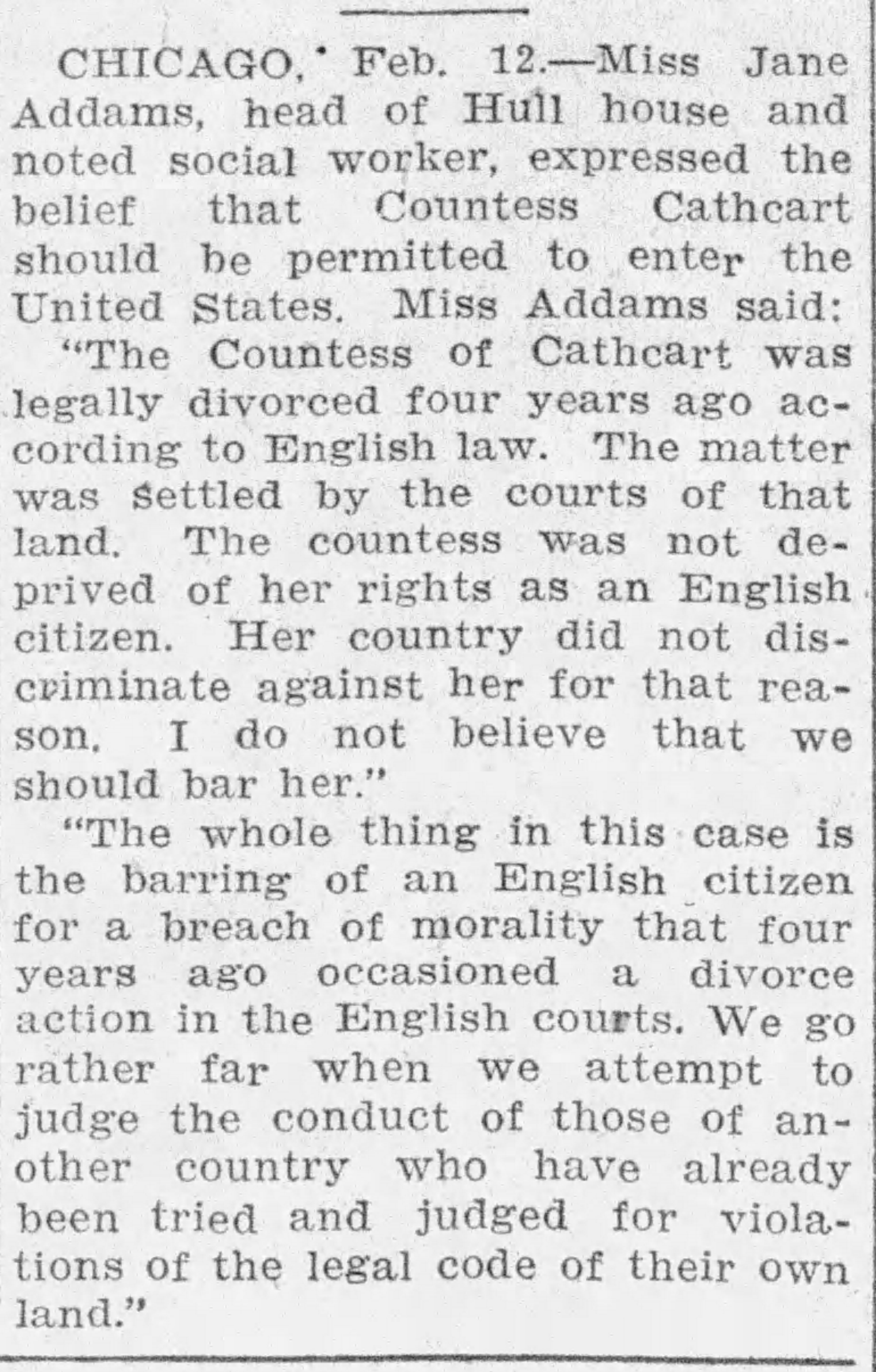 Miss Jane Addams, head of Hull House and noted social worker, expressed the belief that the Countess Cathcart should be permitted to enter the United States. Miss Addams said: