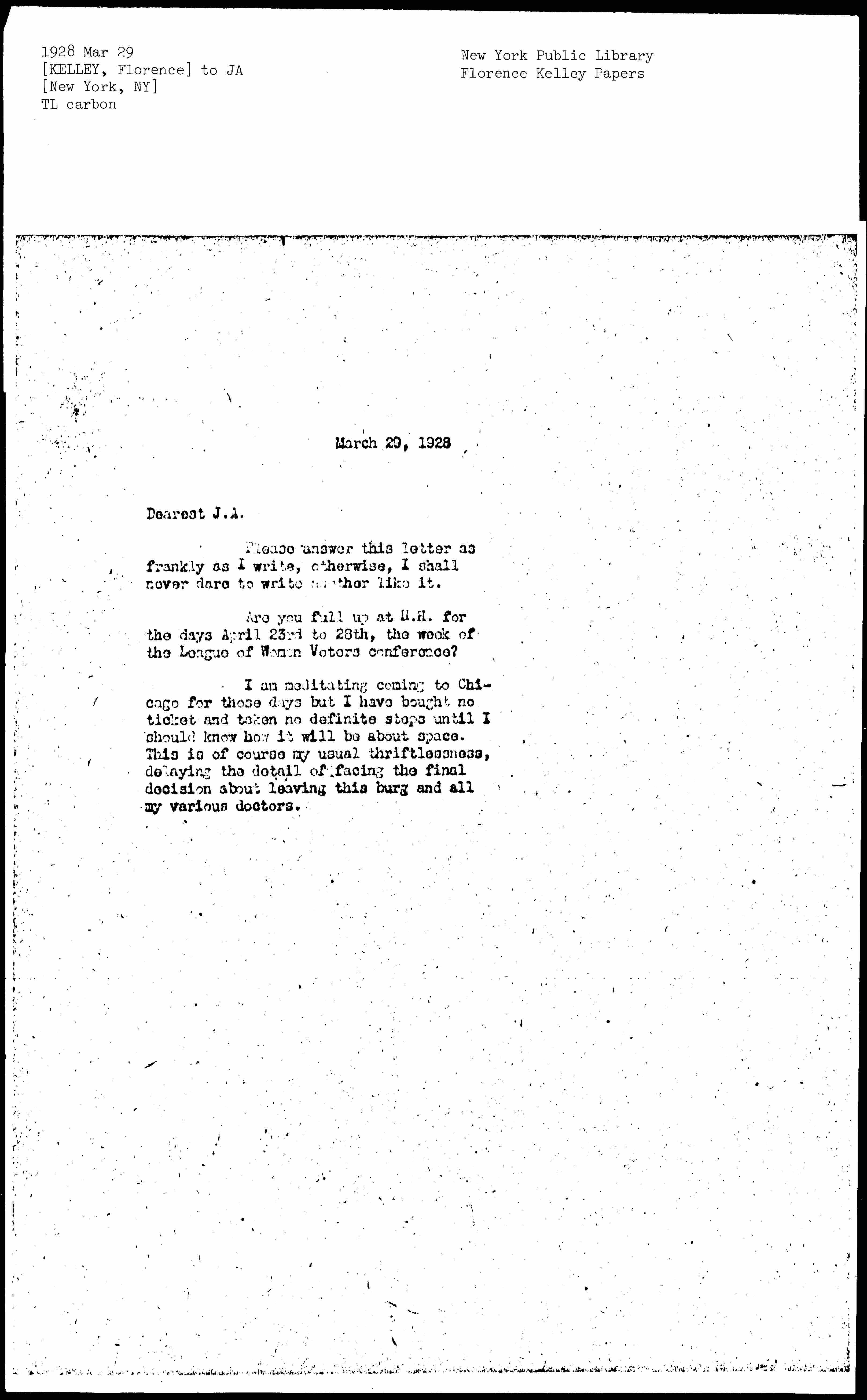 Florence Kelley to Jane Addams, March 29, 1928