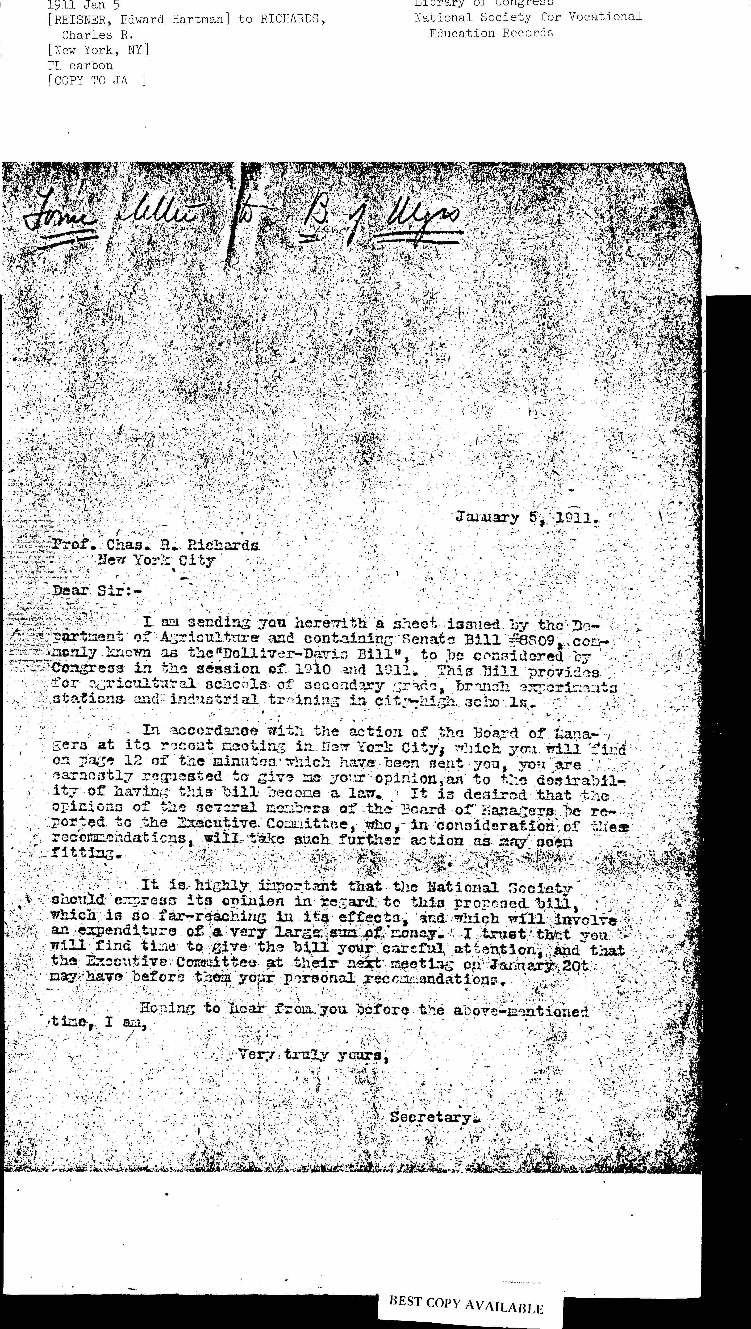I am sending you herewith a sheet issue by the Department of Agriculture and containing Senate Bill #8809, commonly known as the "Dolliver-Davis Bill", to be considered by Congress in the session of 1910 and 1911. This bill provides for agricultural schools of secondary grade, branch experiments stations and industrial training in city-high schools.