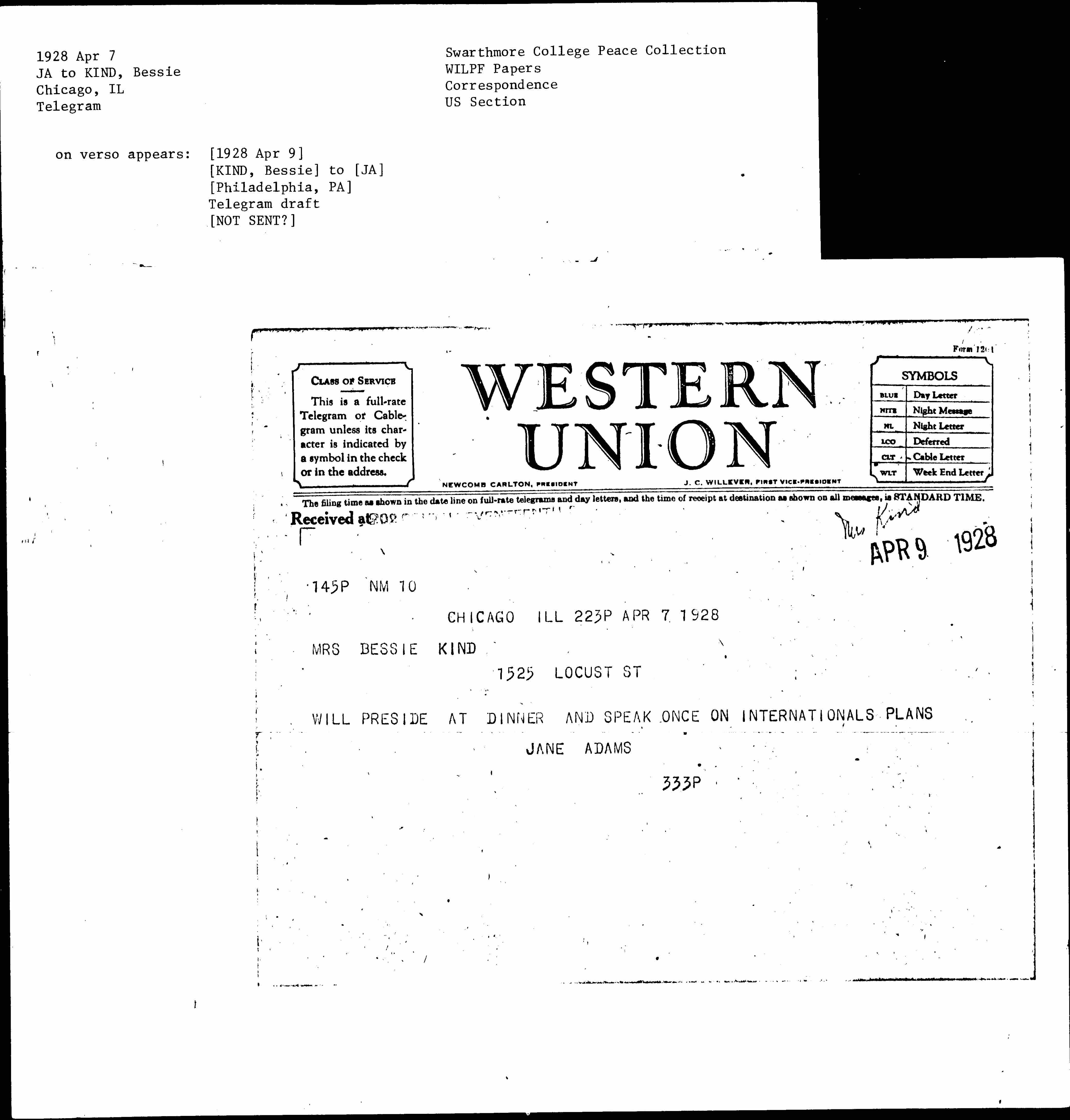 Jane Addams to Bessie Katzenburg Kind, April 7, 1928