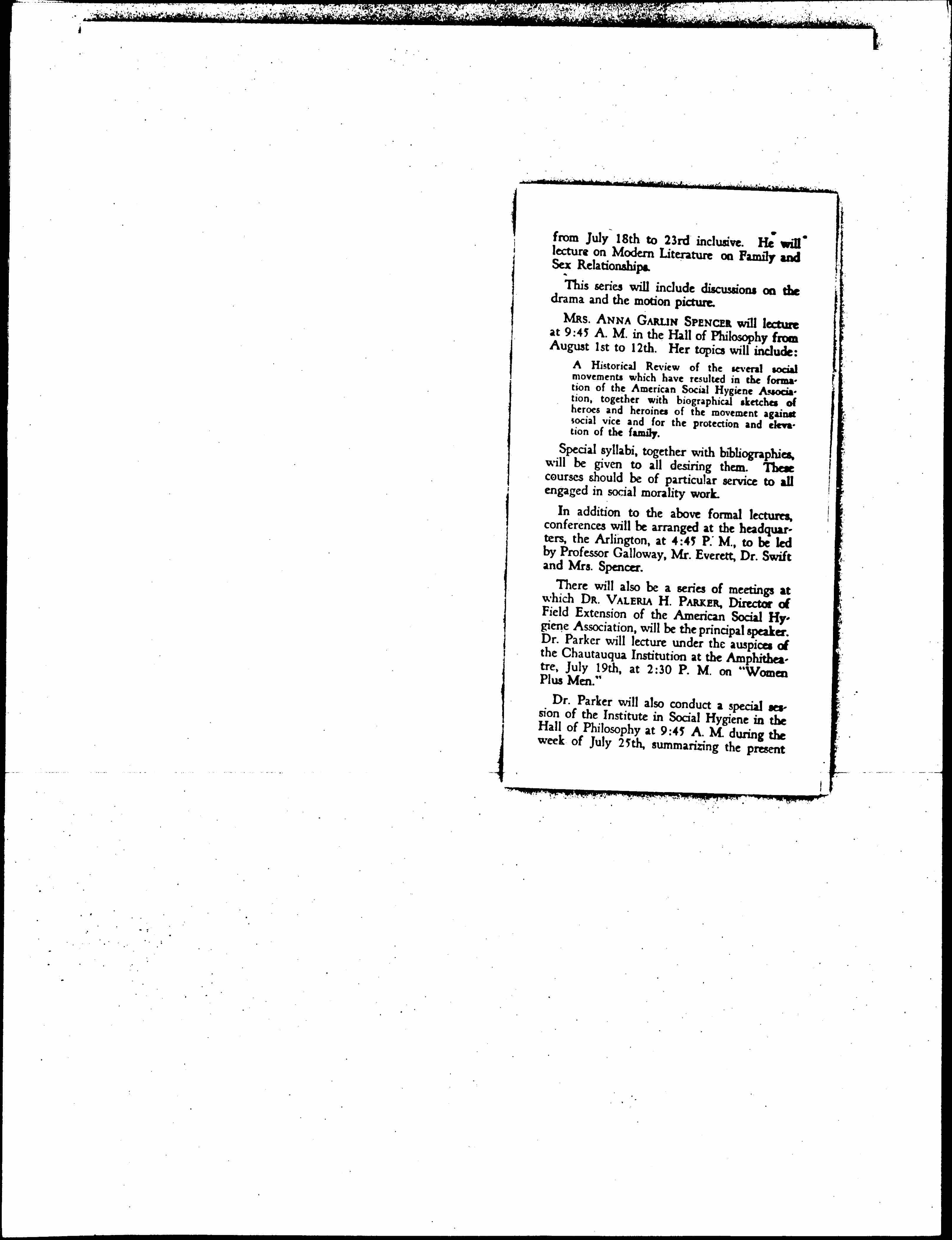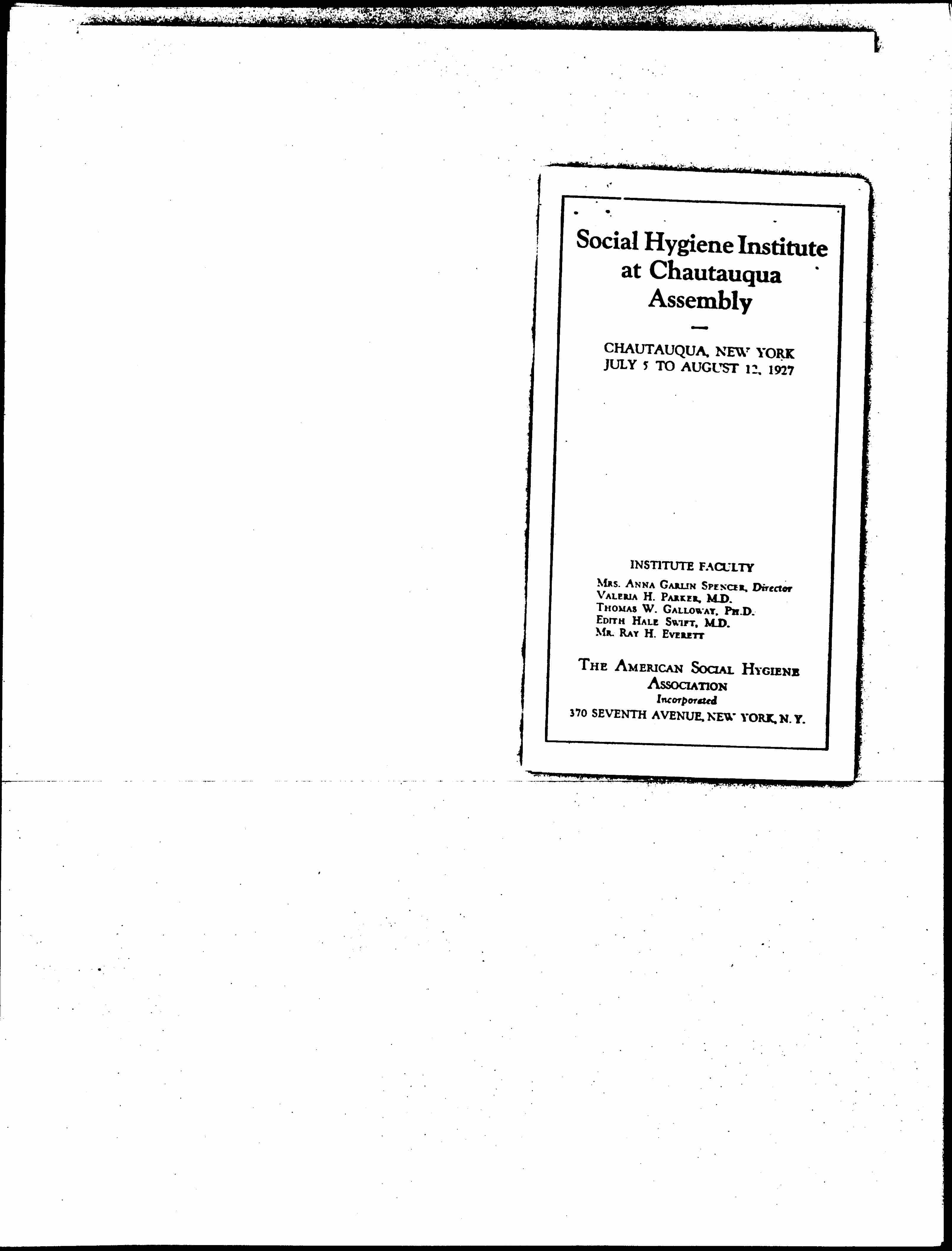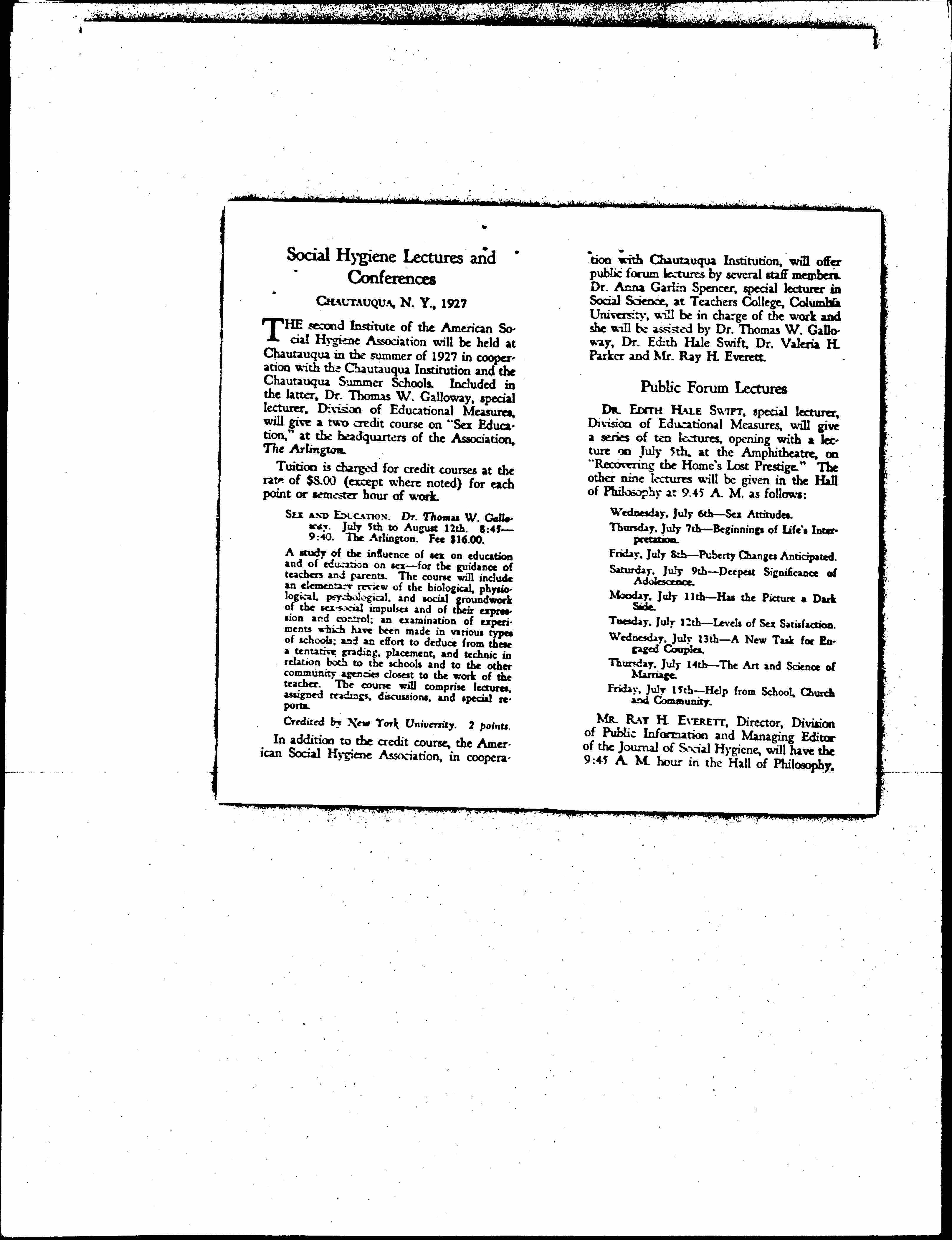 Social Hygiene Institute, July 5 to August 12, 1927
