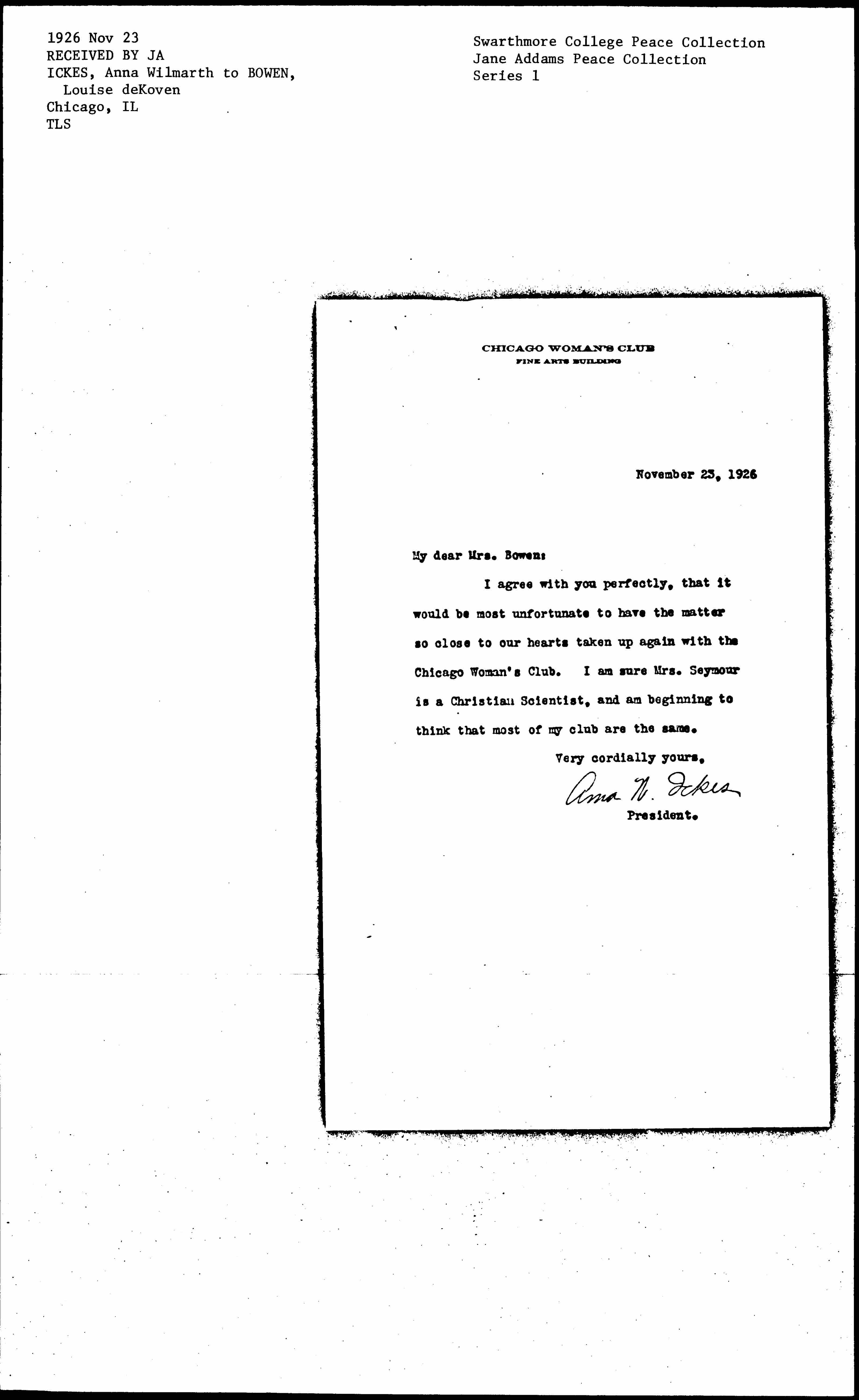 I agree with you perfectly, that it would be most unfortunate to have the matter so close to our hearts taken up again with the Chicago Women's Club. I am sure Mrs. Seymour is a Christian Scientist, and am beginning to think that most of my club are the same.