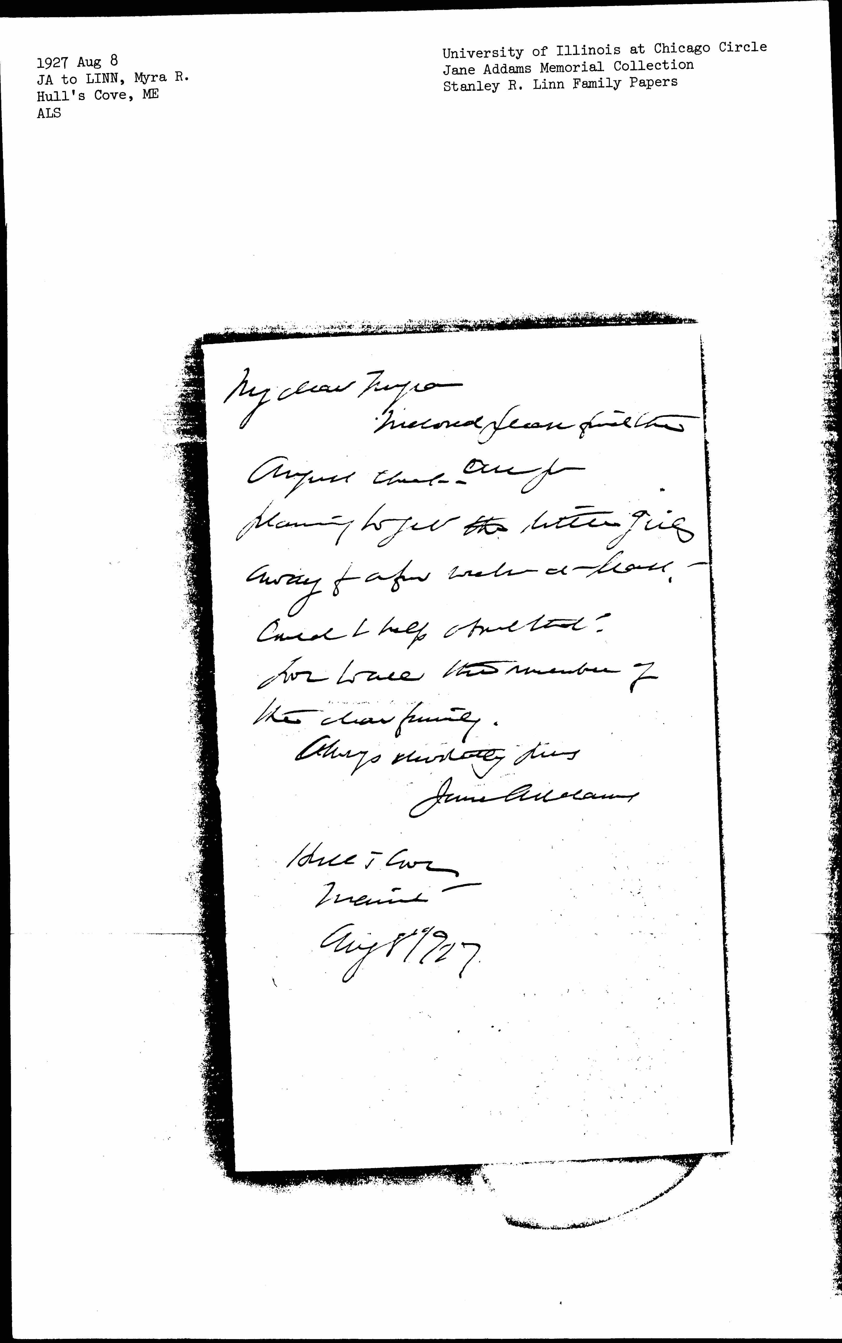Jane Addams to Myra Reynolds Linn, August 8, 1927
