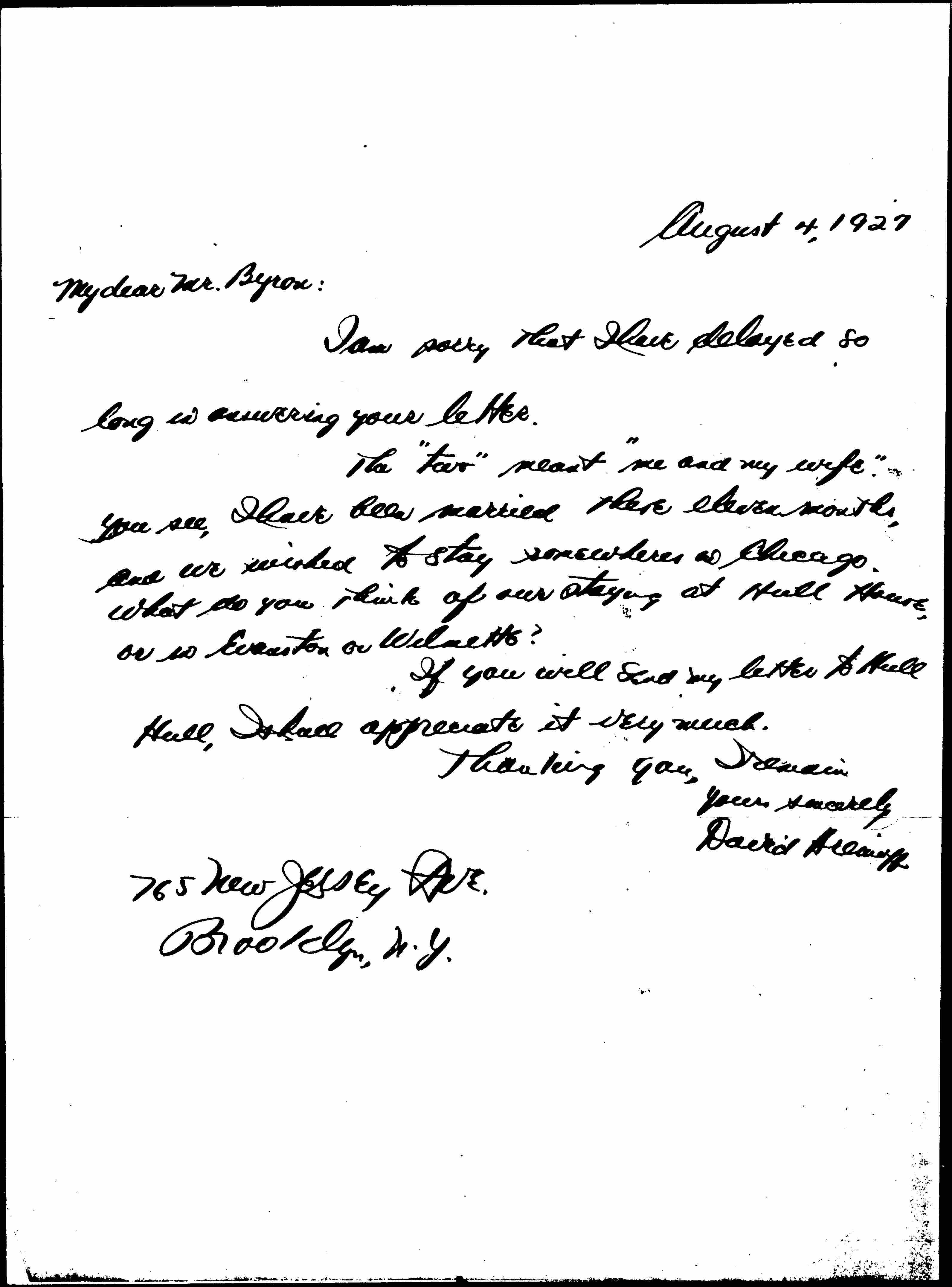 The "two" meant "me and my wife." You see, I have been married these eleven months, and we wished to stay somewheres as Chicago. What do you think of our staying at Hull House, or in Evanston or Wilmette?