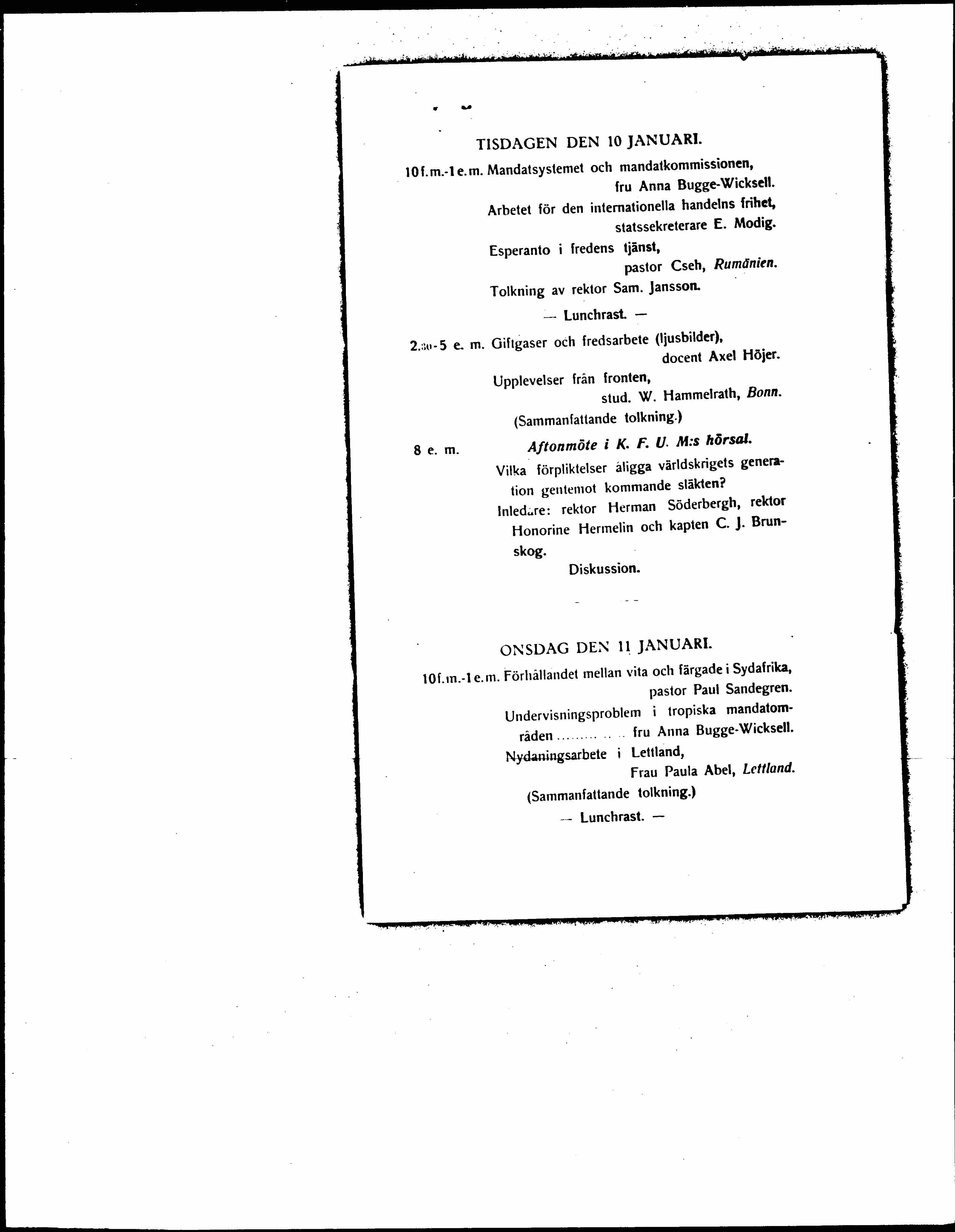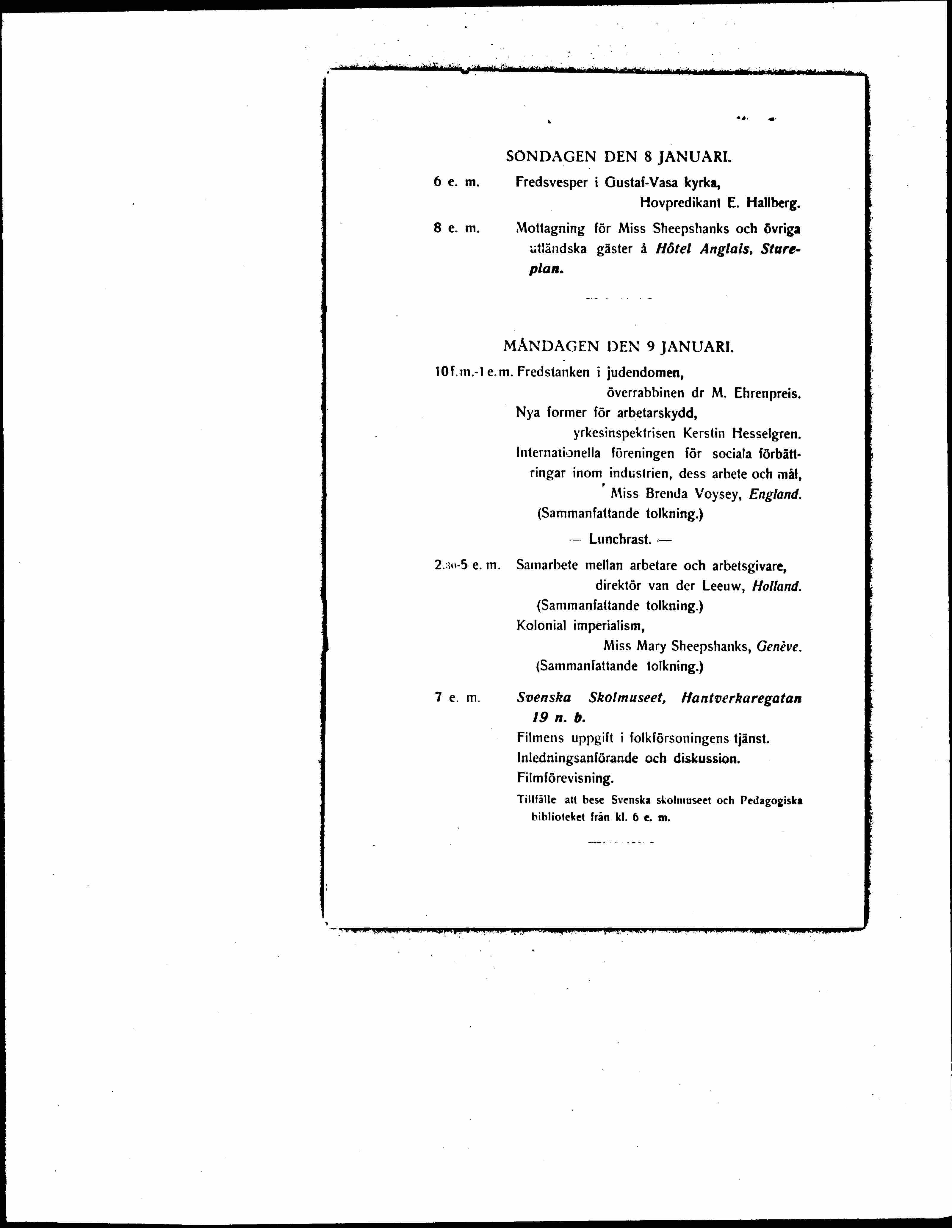 2:30-5 p.m. Lecture on peace (2 lectures), professor Otto Nordenskjöld. Conclusion.