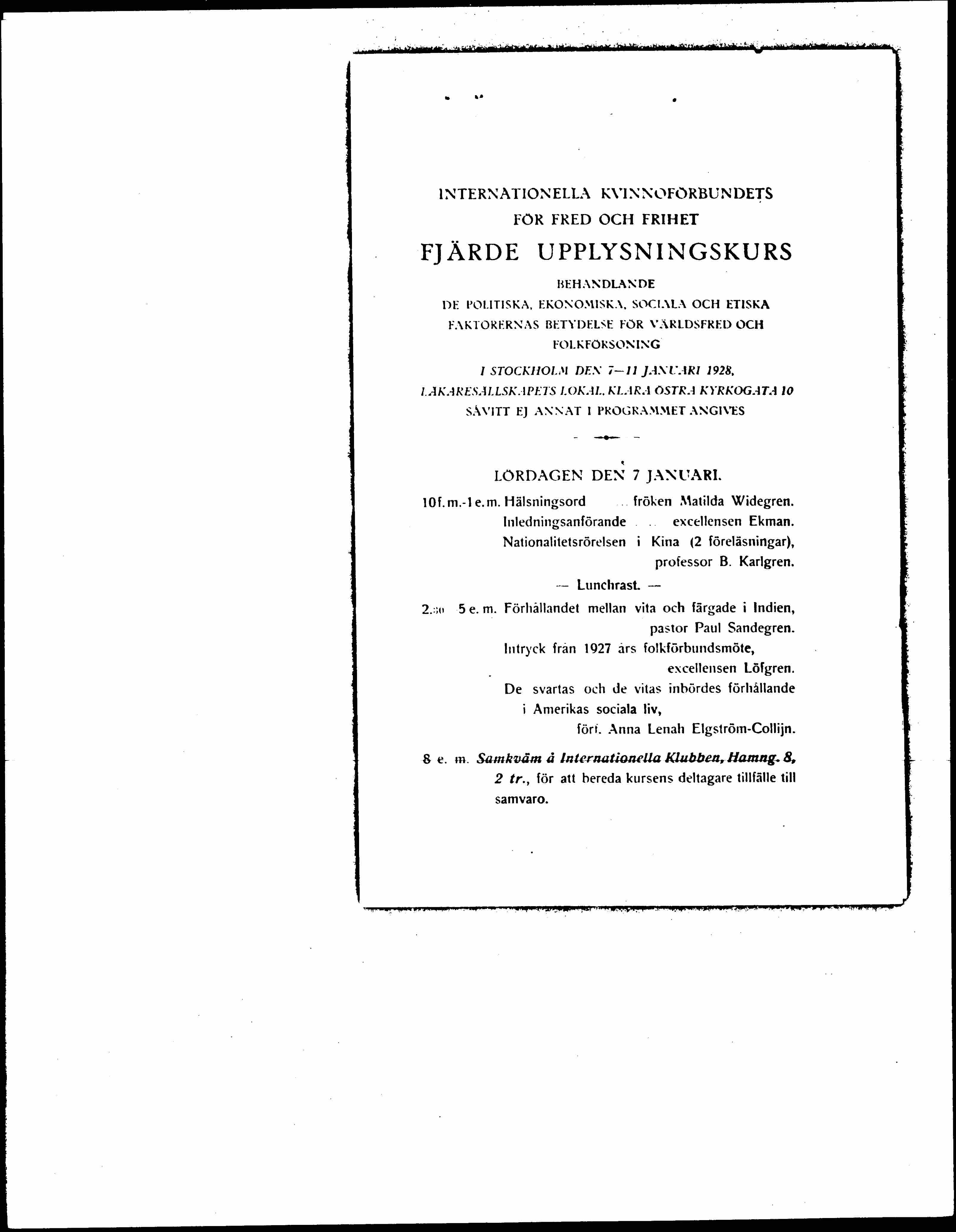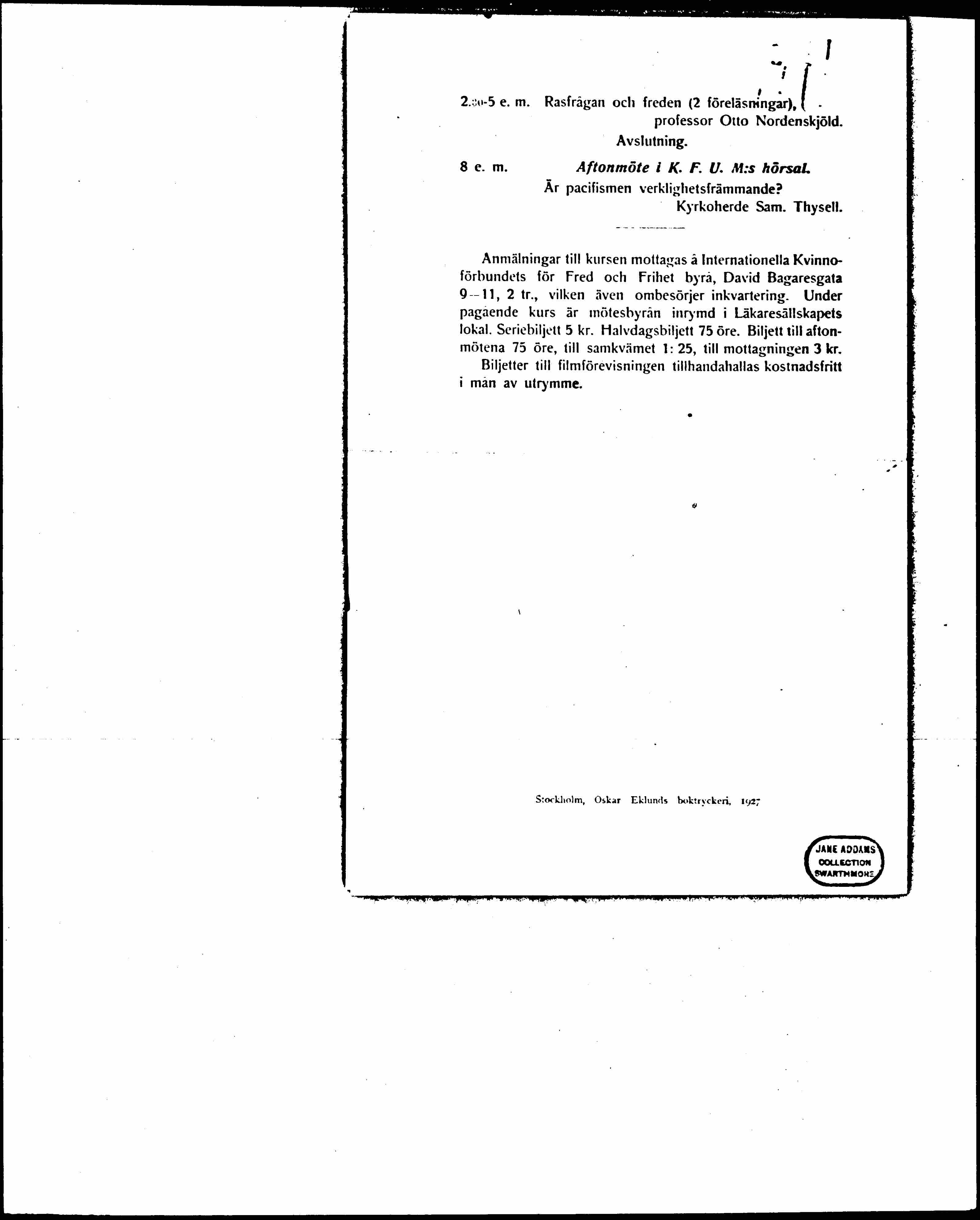 Registrations for the course received at the International Women's League for Peace and Freedom office, David Bagaresgata 9-11, 2 tr., which is also visited during the ongoing course. During the ongoing course, meeting fee is charged at the Läkaresällskapets [Medical Society's] premises. Letter ticket 5 kr. Half-day ticket 75 öre. Ticket for evening meetings 75 öre, for the gathering 1:25, for the reception 3 kr. Tickets for the film screening are available free of charge within the limits of space.
