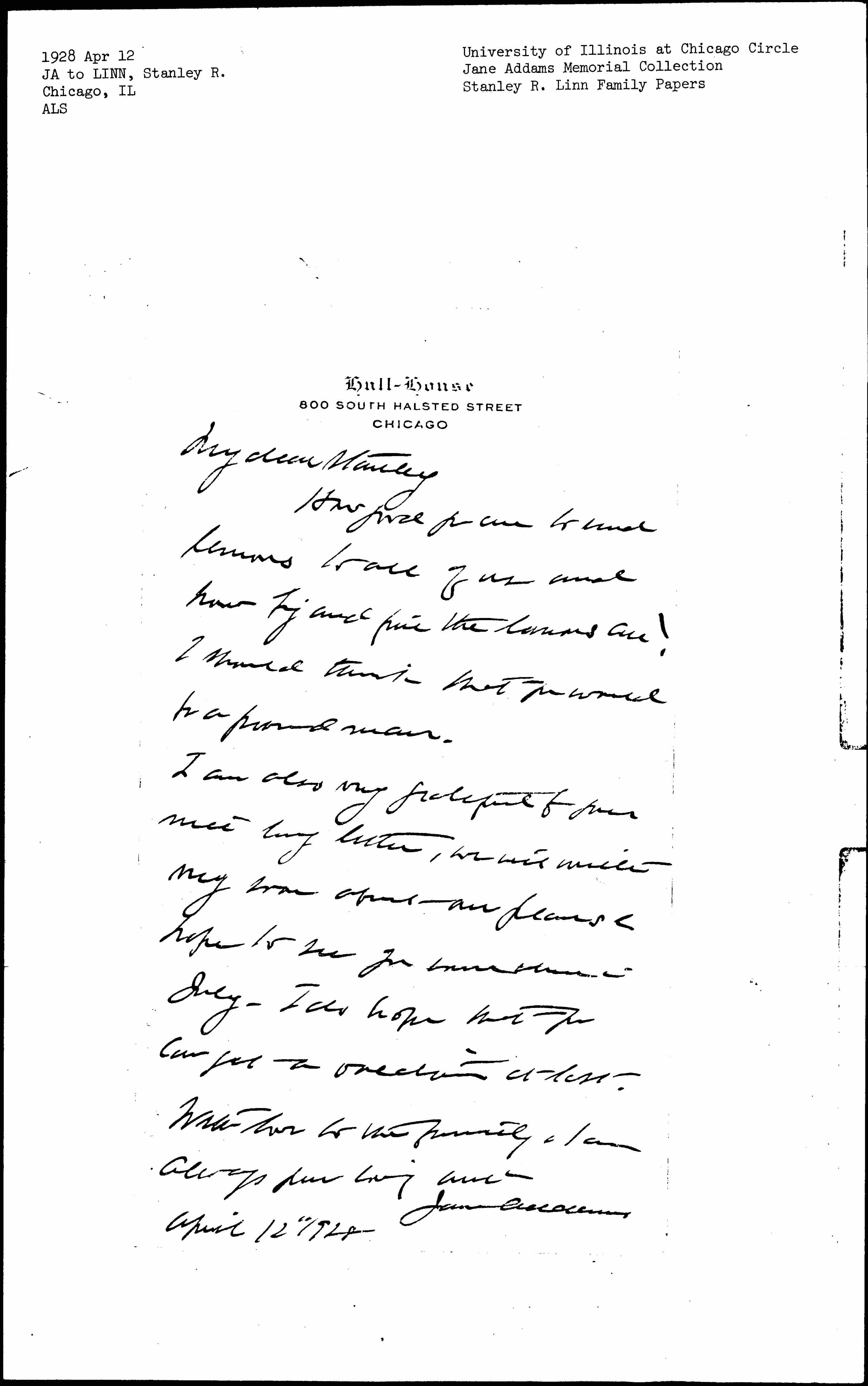 Jane Addams to Stanley Ross Linn, April 12, 1928