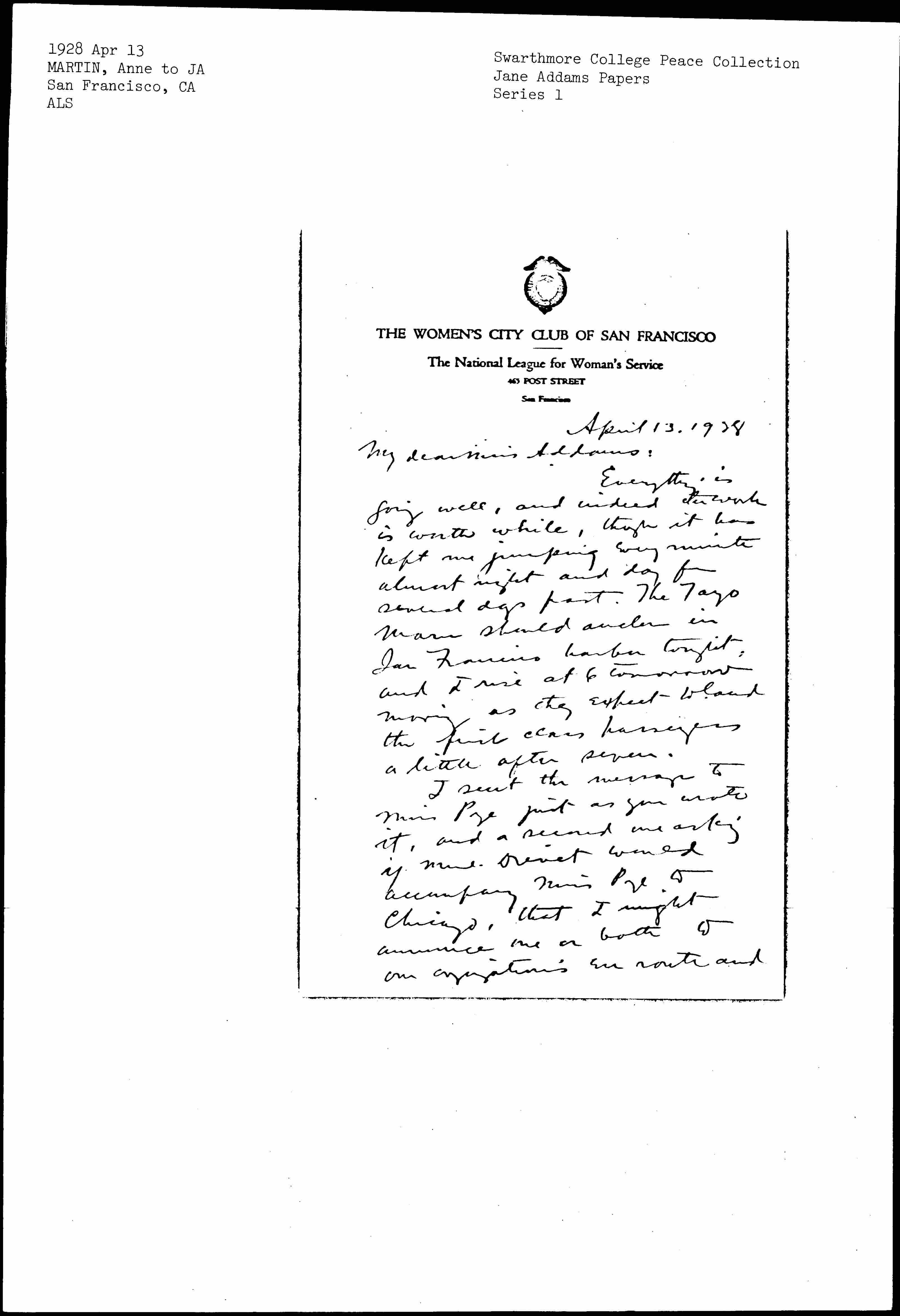 Anne Henrietta Martin to Jane Addams, April 13, 1928