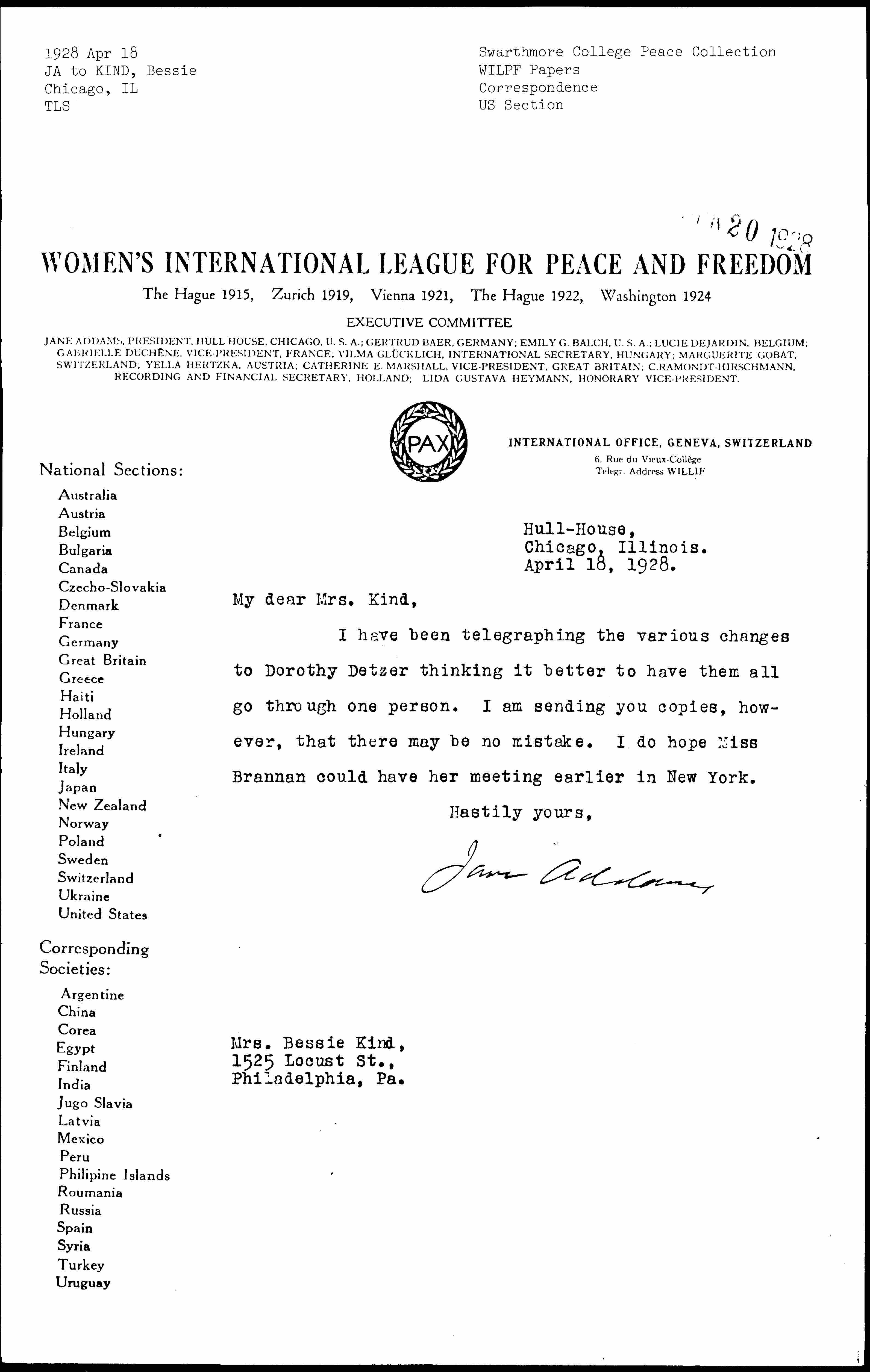 Jane Addams to Bessie Katzenberg Kind Wolf, April 18, 1928
