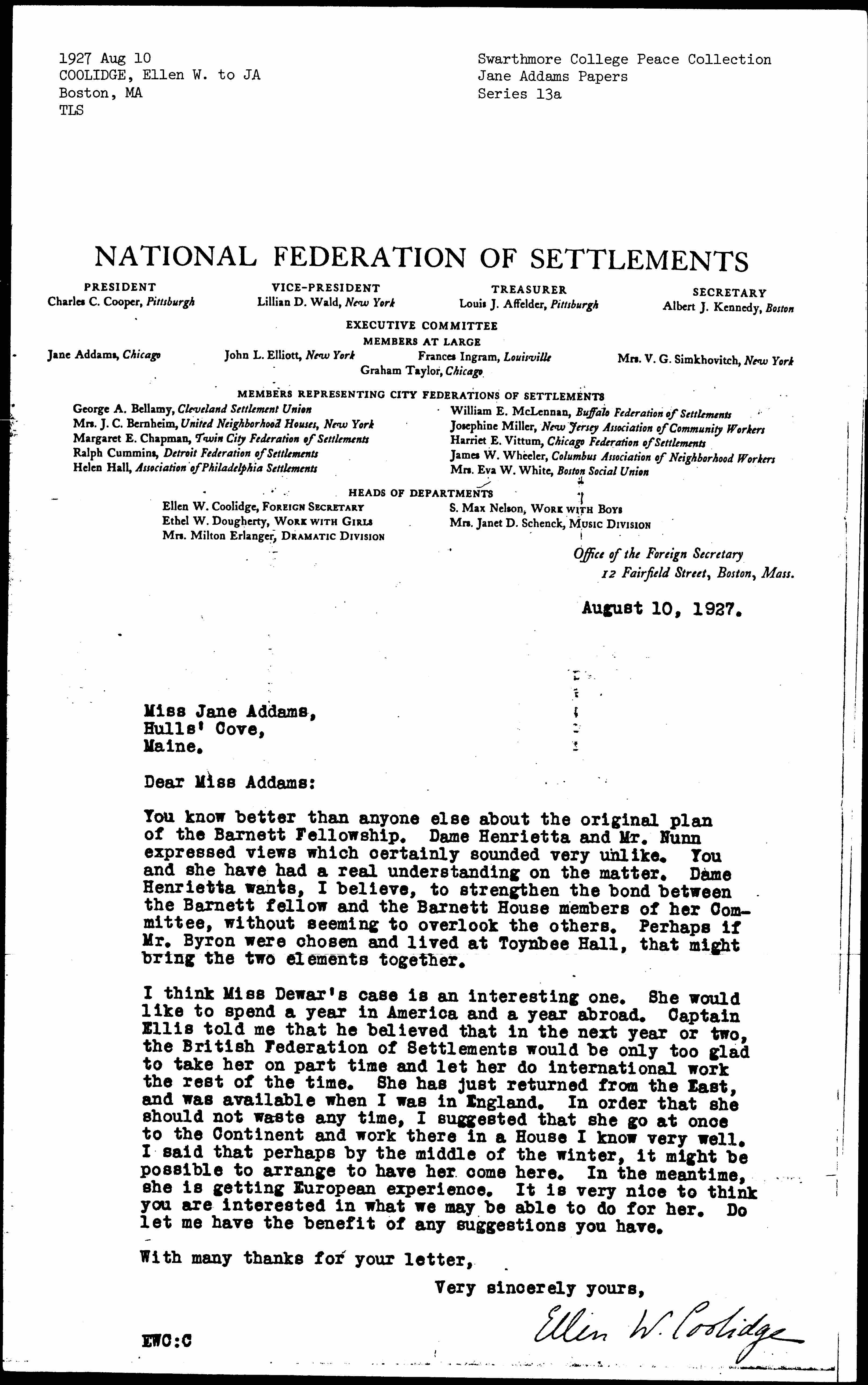 Ellen Wayles Coolidge to Jane Addams, August 10, 1927
