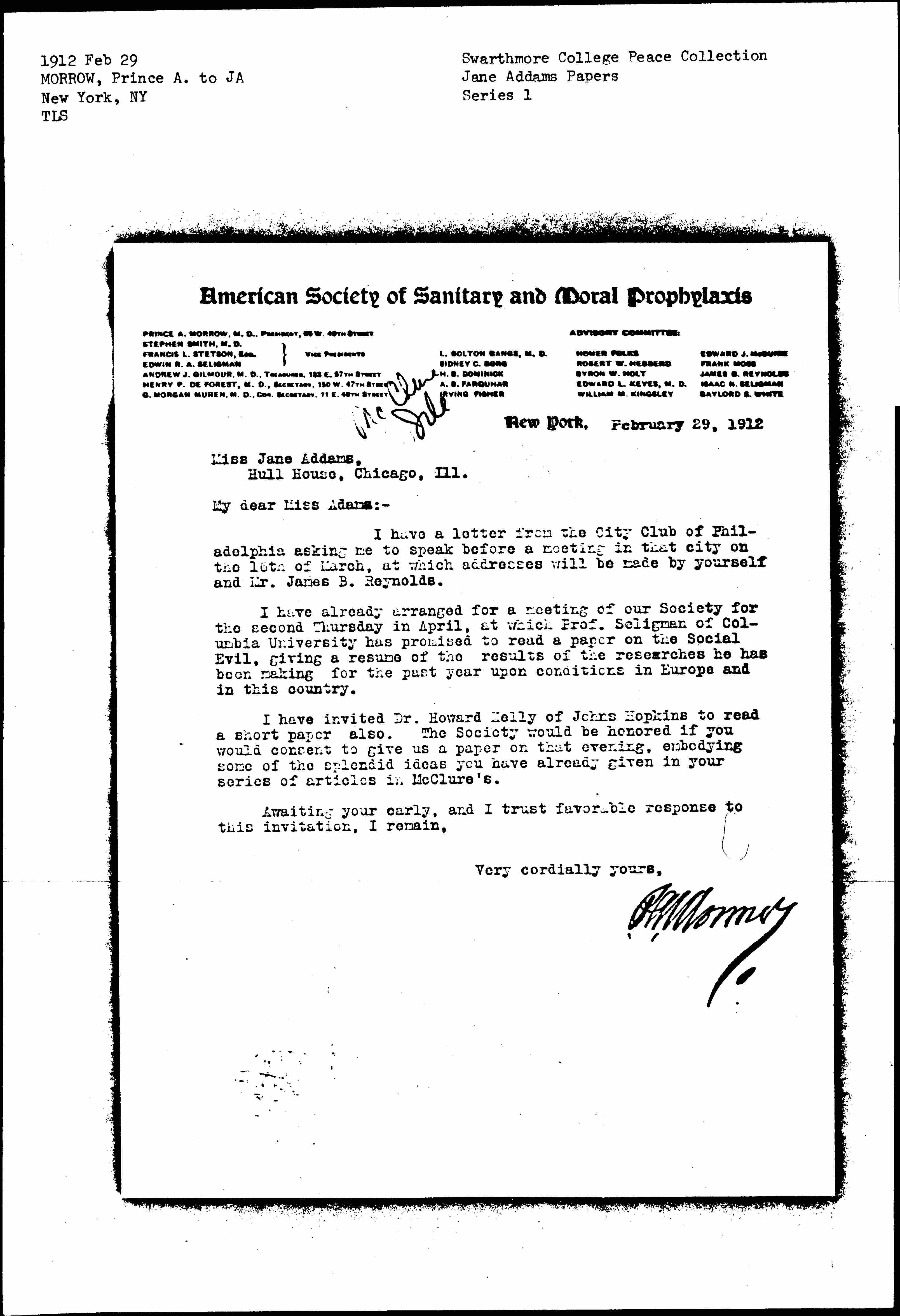 I have already arranged for a meeting of our Society for the second Thursday in April, at which Prof. Seligman of Columbia University has promised to read a paper on the Social Evil, giving a resume of the results of the researches he has been making for the past year upon conditions in Europe and in this country.