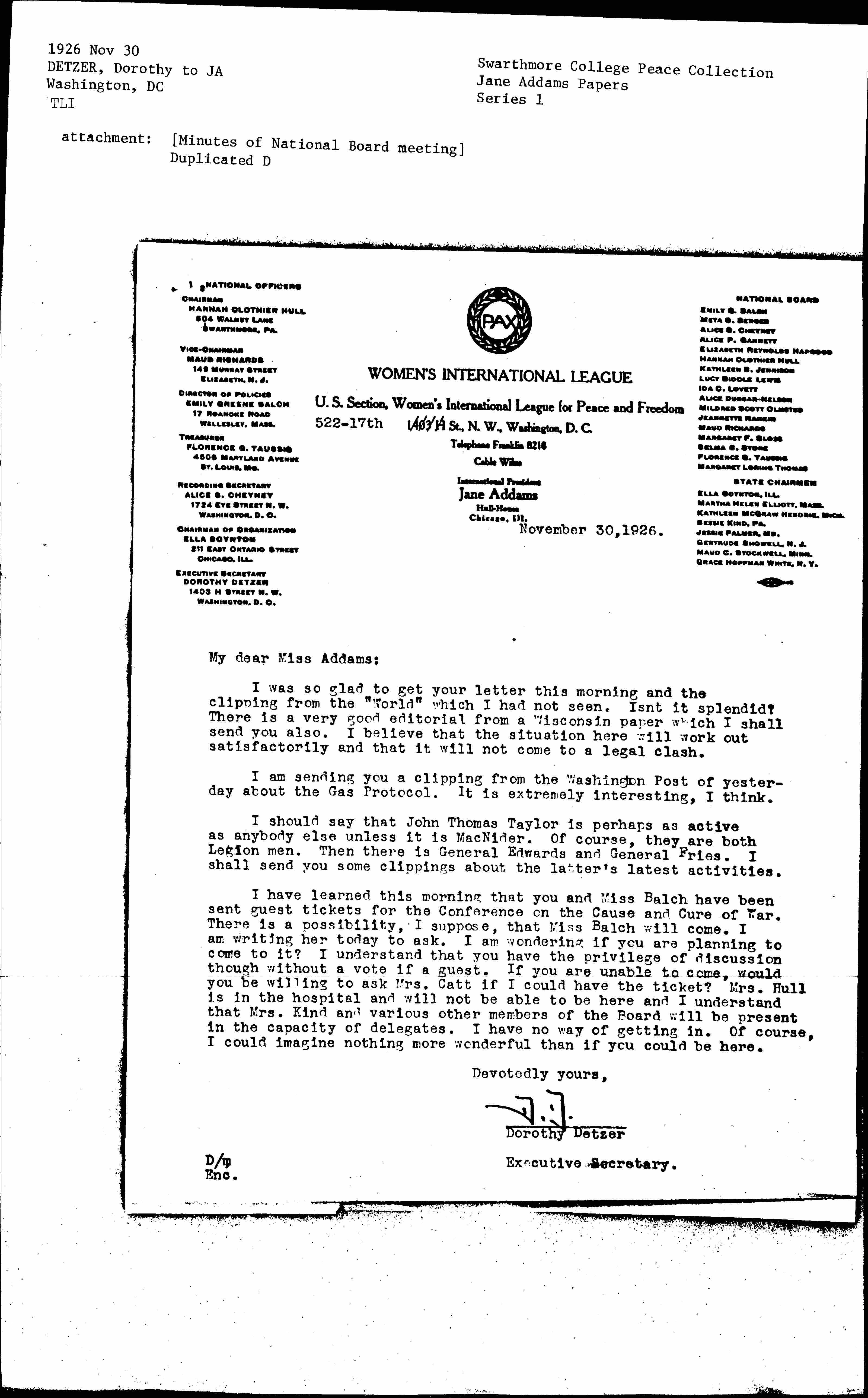 I have learned this morning that you and Miss Balch have been sent guest tickets for the Conference on the Cause and Cure of War. There is a possibility, I suppose, that Miss Balch will come. I am writing her today to ask. I am wondering if you are planning to come to it? I understand that you have the privilege of discussion though without a vote if a guest. If you are unable to come, would you be willing to ask Mrs. Catt if I could have the ticket? Mrs. Hull is in the hospital and will not be able to be here and I understand that Mrs. Kind and various other members of the Board will be present in the capacity of delegates. I have no way of getting in. Of course, I could imagine nothing more wonderful than if you could be here.
