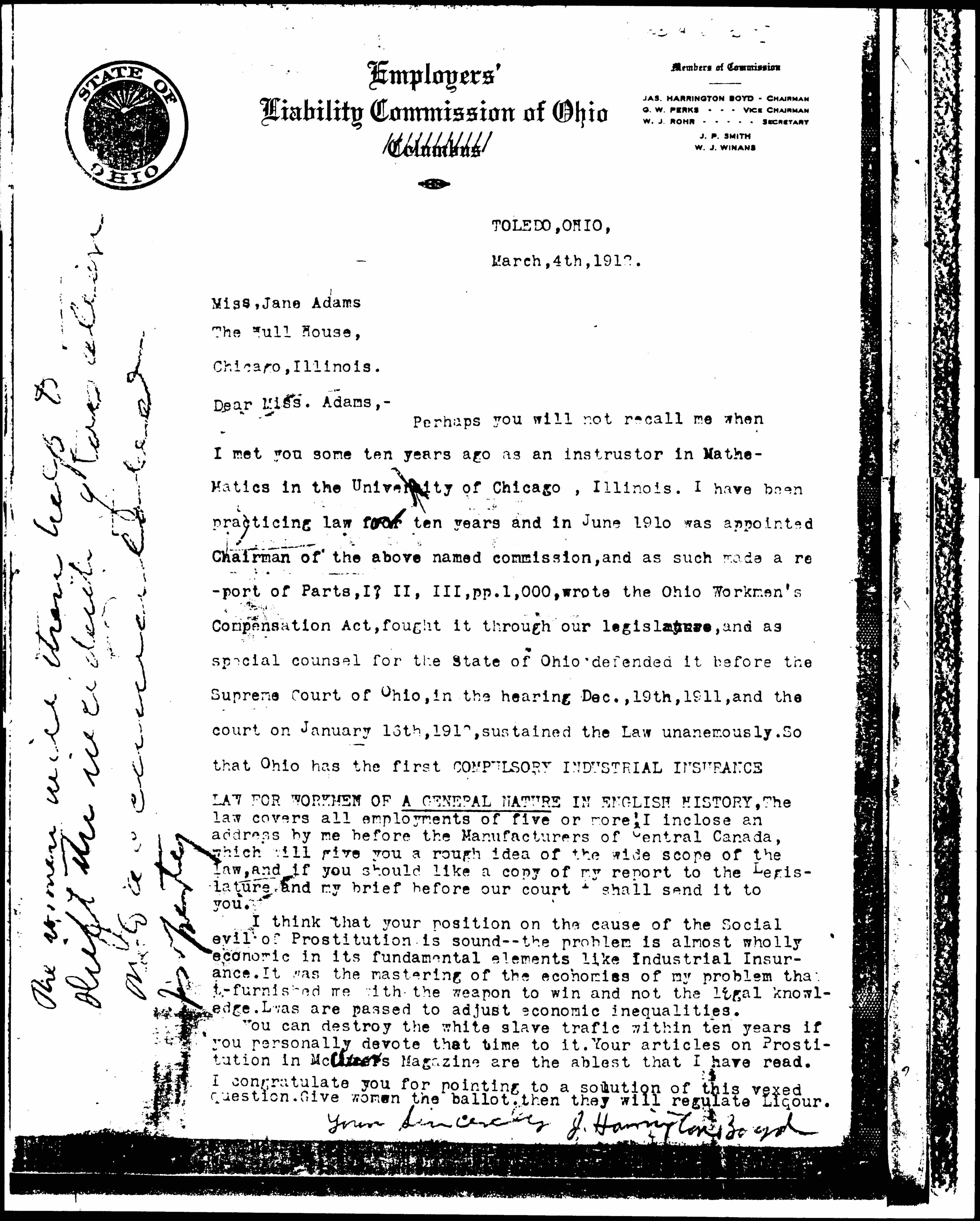 Perhaps you will not recall me when I met you some ten years ago as an instructor in Mathematics in the University of Chicago, Illinois. I have been practicing law for ten years and in June 1910 was appointed Chairman of the above named commission, and as such made a report of Parts, I, II, III, pp. 1,000, wrote the Ohio Workmen's Compensation Act, fought it through our legislature, and as special counsel for the State of Ohio defended it before the Supreme Court of Ohio, in the hearing Dec., 19th, 1911, and the court on January 13th, 1912, sustained the Law [unanimously]. So that Ohio has the first COMPULSORY INDUSTRIAL INSURANCE LAW FOR WOMEN OF A GENERAL NATURE IN ENGLISH HISTORY. The Law covers all employments of five or more! I [enclose] an address by me before the Manufacturers of Central Canada, which will give you a rough idea of the wide scope of the law, and if you should like a copy of my report to the Legislature and my brief before our court I shall send it to you.