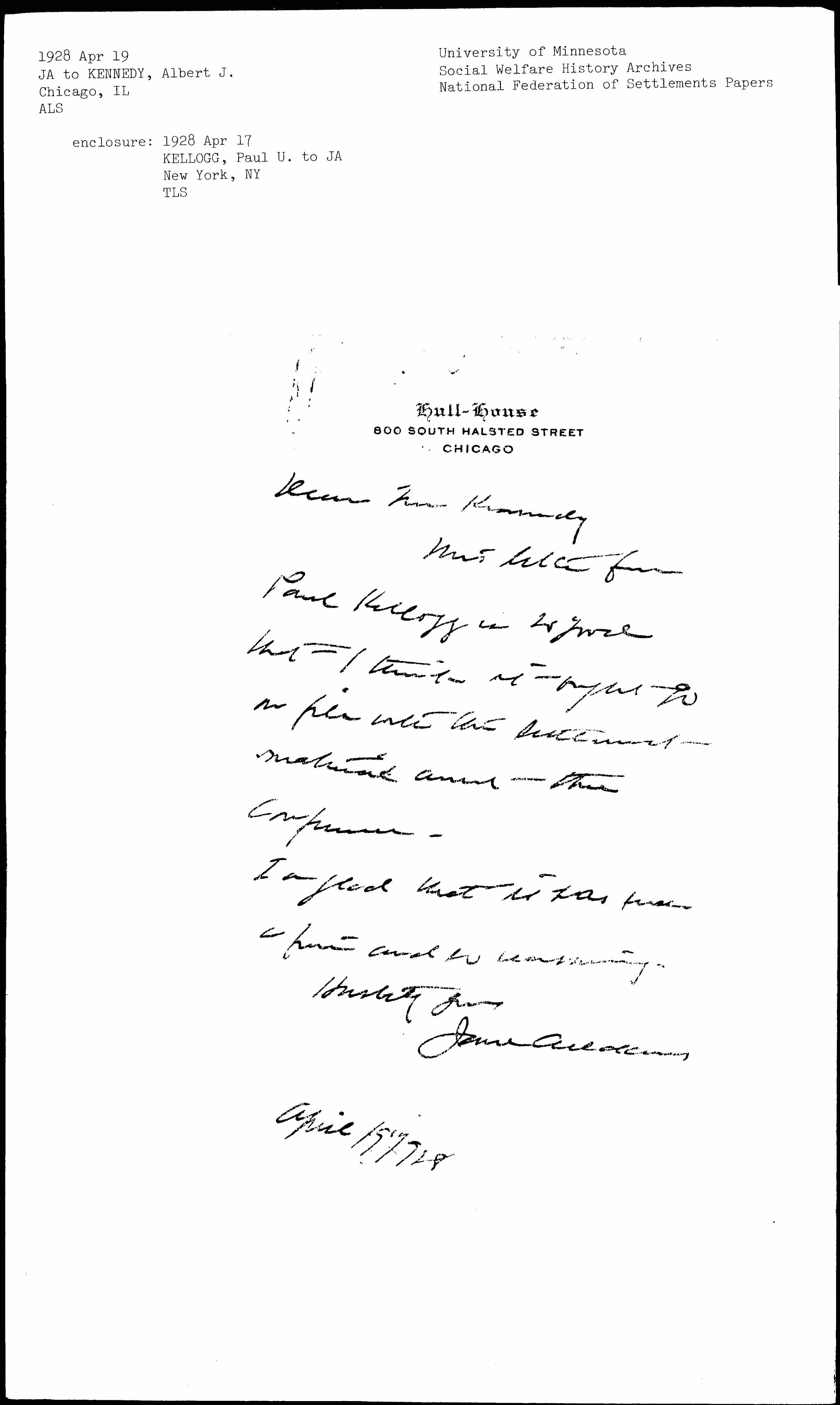 Jane Addams to Albert Joseph Kennedy, April 19, 1928