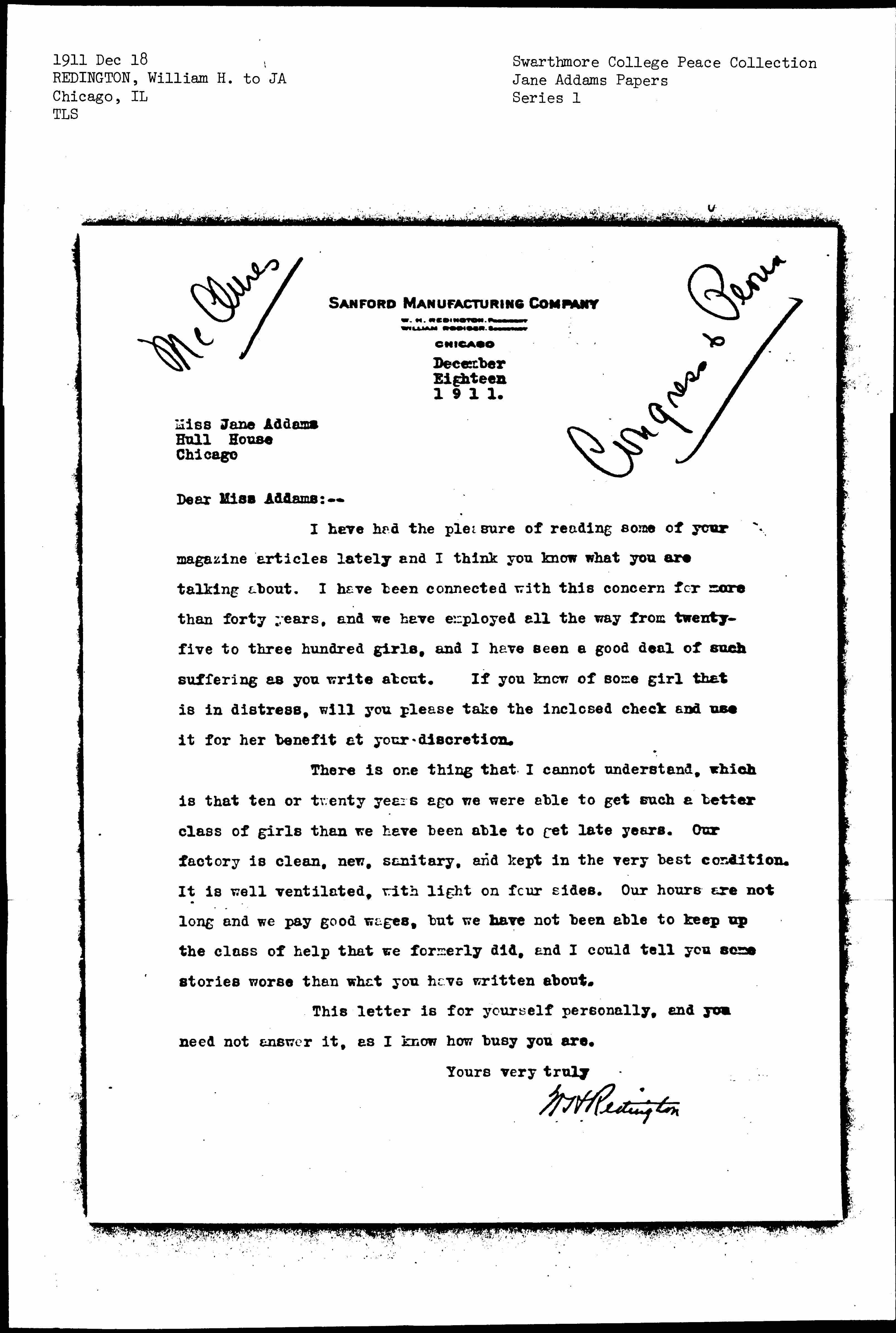 I have had the pleasure of reading some of your magazine articles lately and I think you know what you are talking about. I have been connected with this concern for more than forty years, and we have employed all the way from twenty-five to three hundred girls, and I have seen a good deal of such suffering as you write about. If you know of some girl that is in distress, will you please take the enclosed check and use it for her benefit at your discretion.