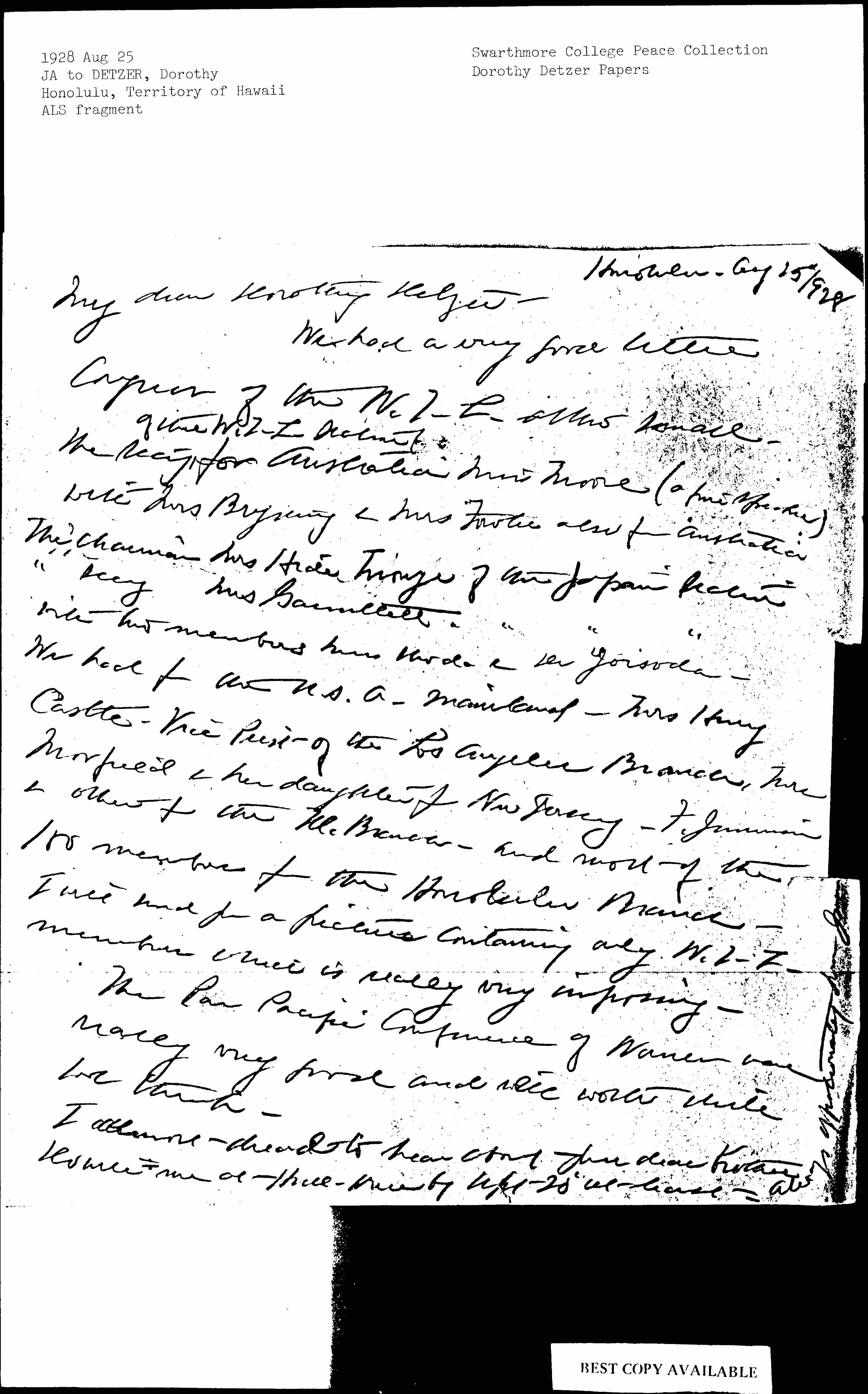 Jane Addams to Dorothy Detzer, August 25, 1928
