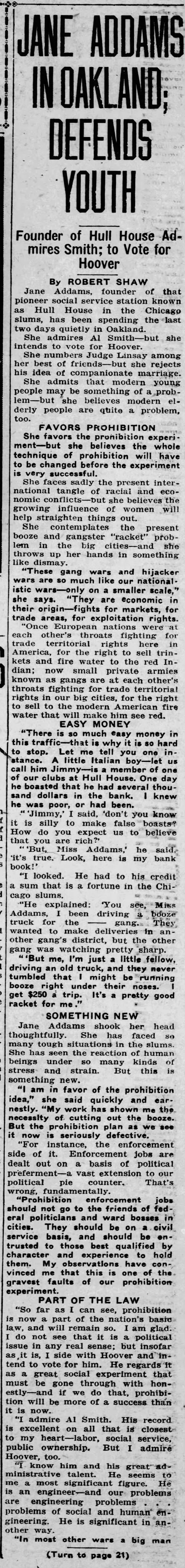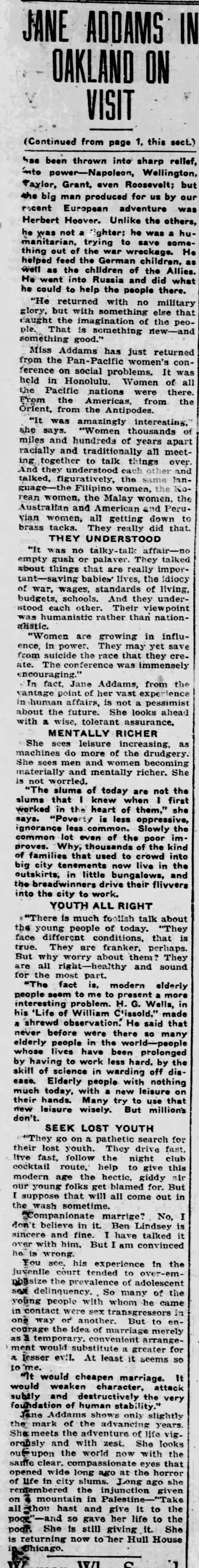 Jane Addams in Oakland; Defends Youth, September 17, 1928