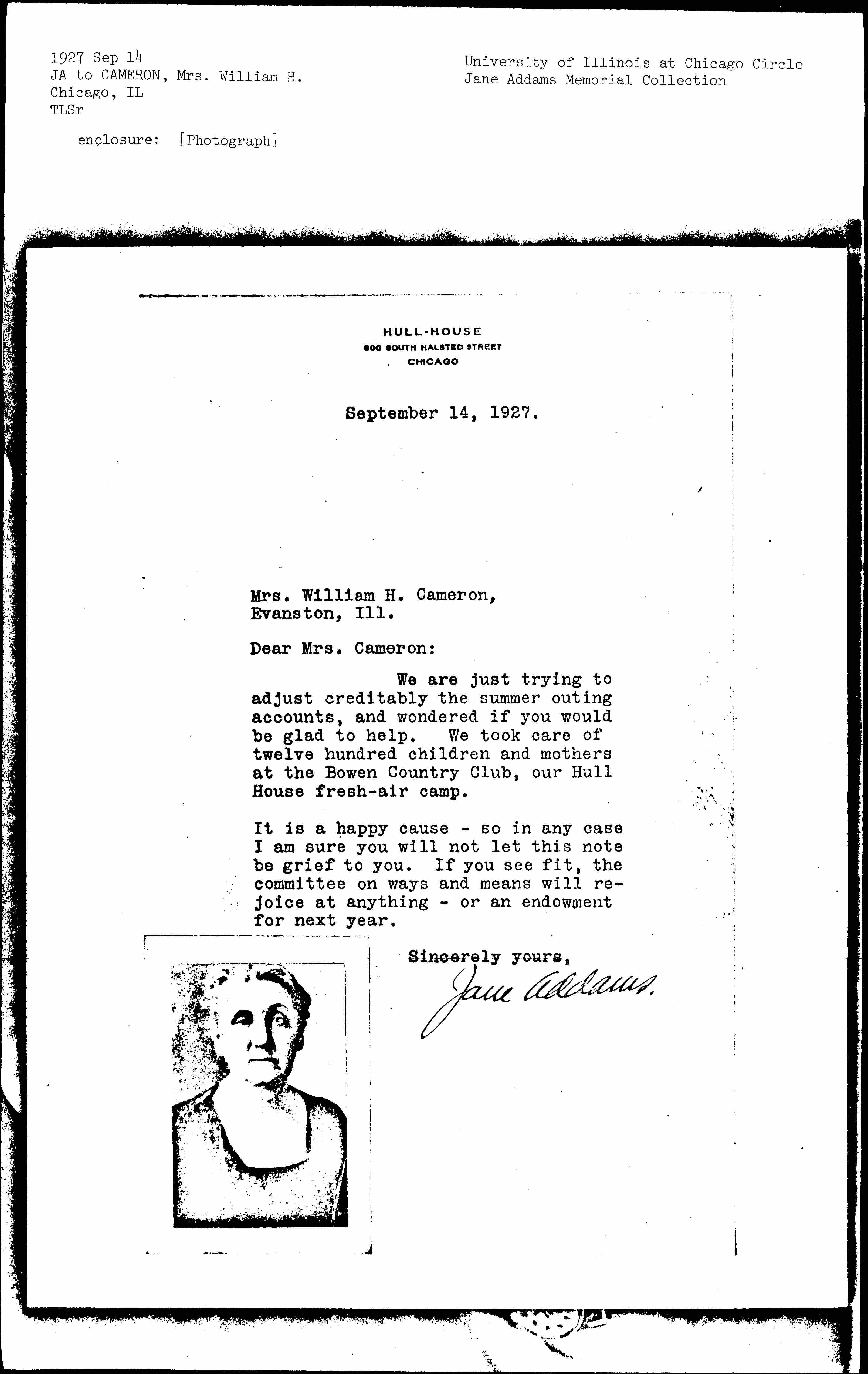 We are just trying to adjust creditably the summer outing accounts, and wondered if you would be glad to help. We took care of twelve hundred children and mothers at the Bowen Country Club, our Hull House fresh-air camp.
