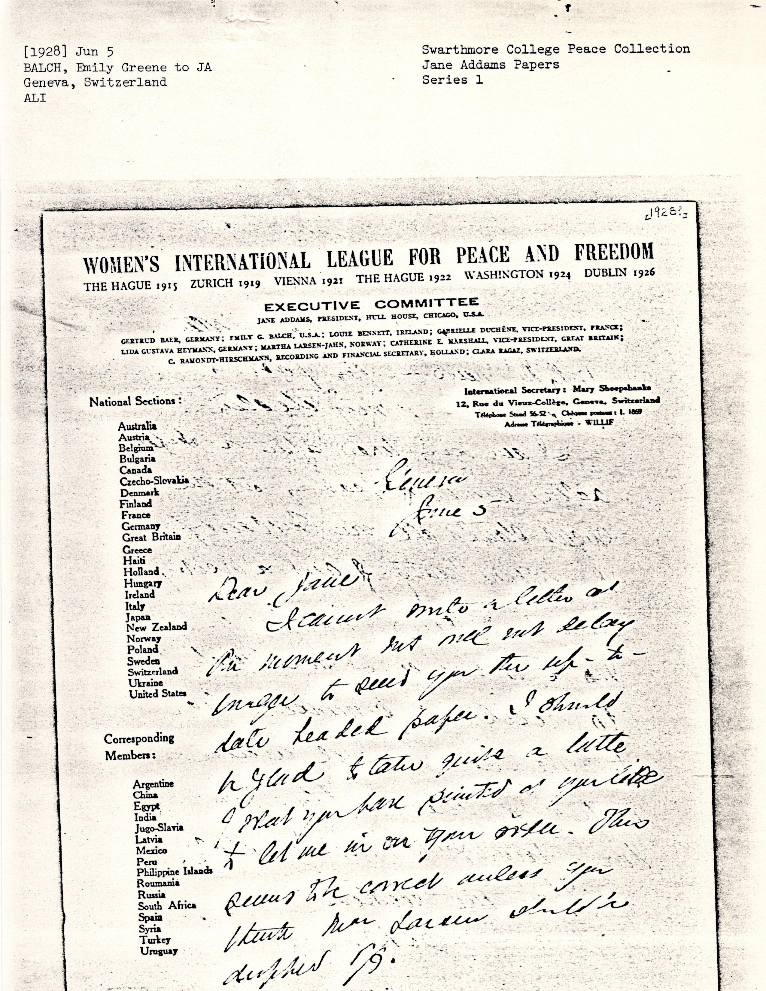 Emily Greene Balch to Jane Addams, June 5, 1928