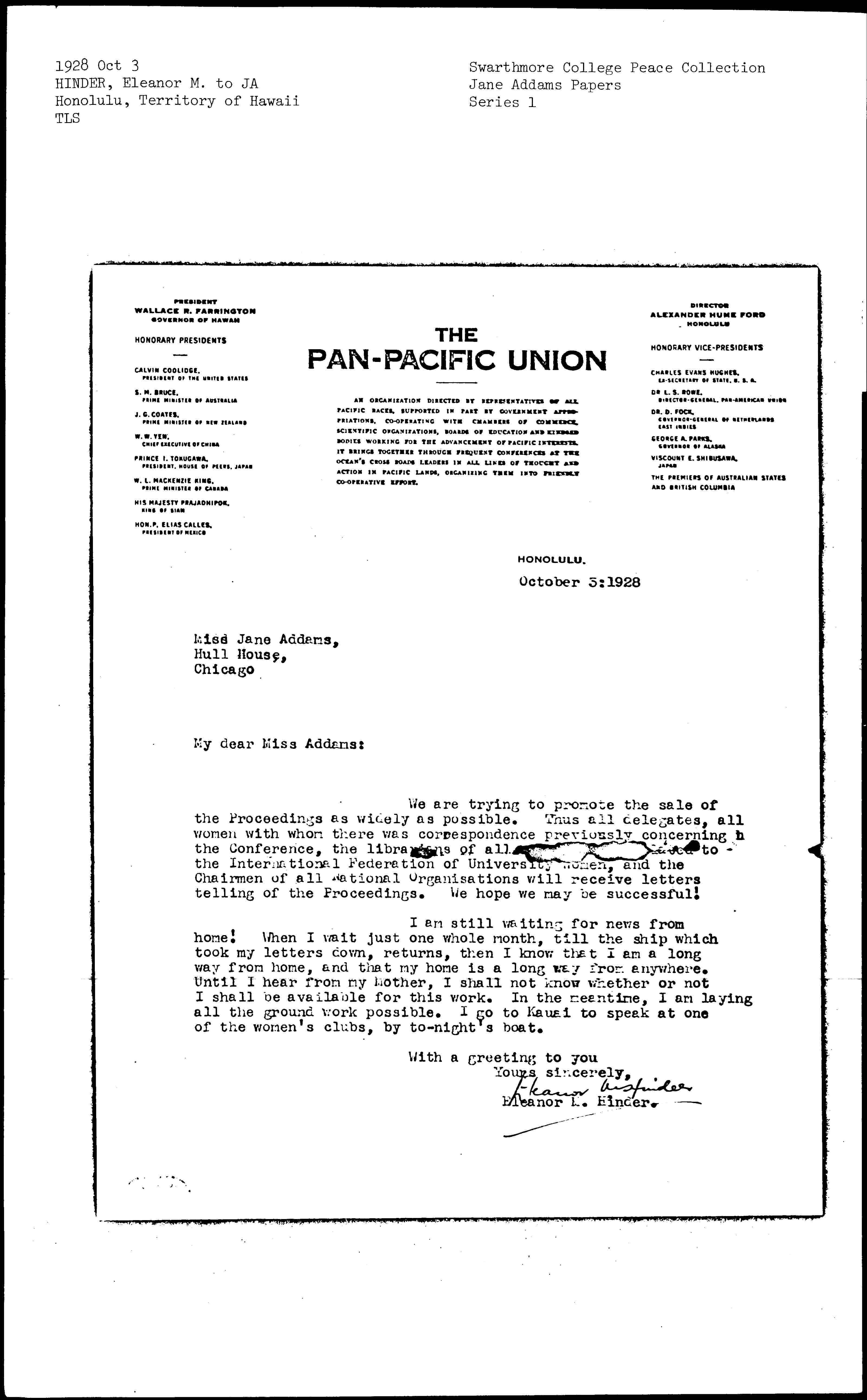 Eleanor Mary Hinder to Jane Addams, October 3, 1928