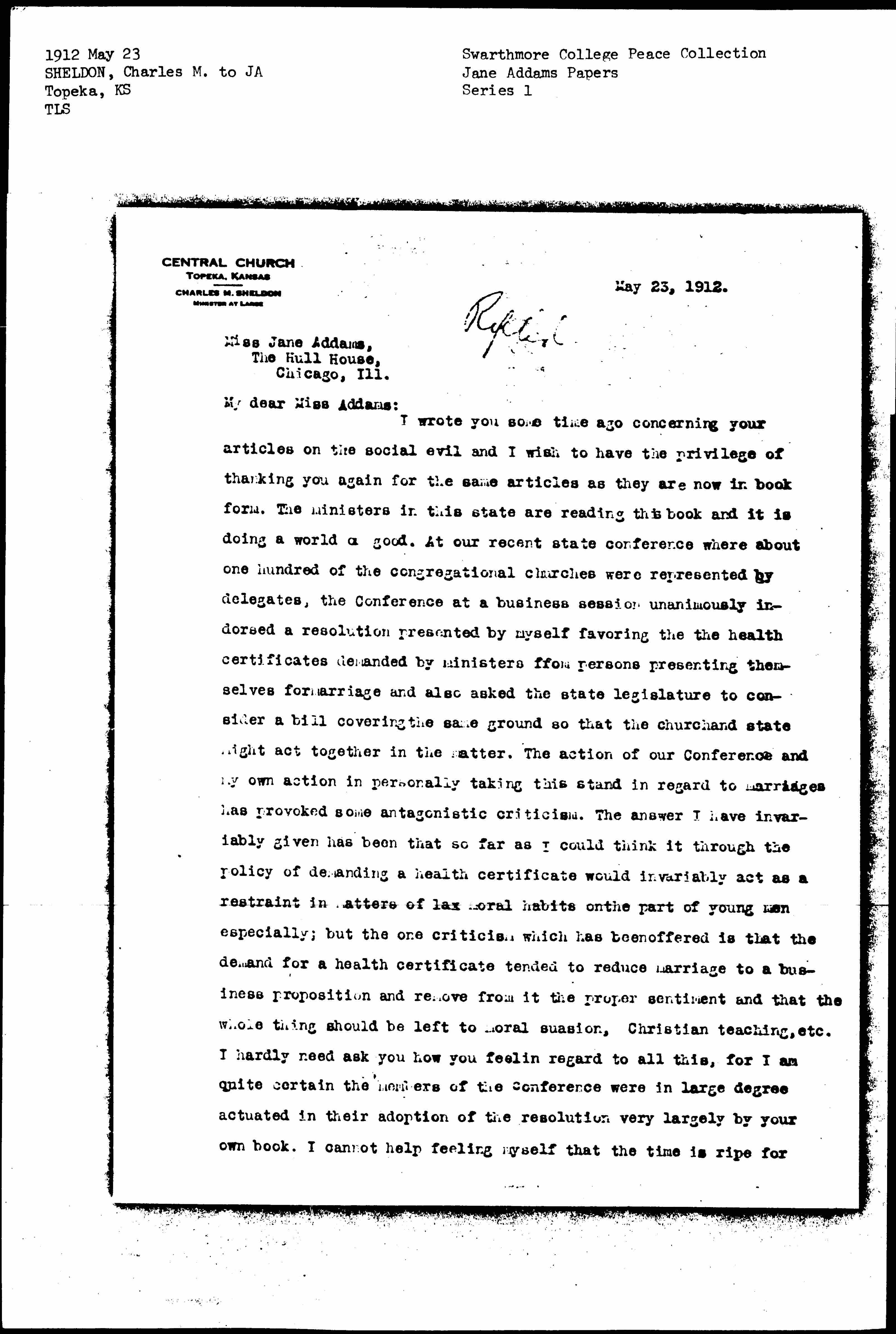 I wrote you some time ago concerning your articles on the social evil and I wish to have the privilege of thanking you again for the same articles as they are now in book form. The ministers in this state are reading this book and it is doing a world of good. At our recent state conference where about one hundred of the congregational churches were represented by delegates, the Conference at a business session unanimously [endorsed] a resolution presented by myself favoring the health certificates demanded by ministers from persons presenting themselves for marriage and also asked the state legislature to consider a bill covering the same ground so that the church and state might act together in the matter. The action of our Conference and my own action in personally taking this stand in regard to marriages has provoked some antagonistic criticism. The answer I have invariably given has been that so far as I could think it through the policy of demanding a health certificate would invariably act as a restraint in matters of lax moral habits on the part of young men especially; but the one criticism which has been offered is that the demand for a health certificate tended to reduce marriage to a business proposition and remove from it the proper sentiment and that the whole thing should be left to moral suasion, Christian teaching, etc. I hardly need ask you how you feel in regard to all this, for I am quite certain the members of the Conference were in large degree actuated in their adoption of the resolution very largely by your own book. I cannot help feeling myself that the time is ripe for [page 2] concerted action on the part of the church in regard to the entire matter which you have so splendidly emphasized. I want to do my part in this matter and do it wisely. I would appreciate a note from you which I might quote as I go out into the lecture field where I purpose to speak on the subject in connection with my message. I find everywhere I go that your opinion is exceedingly valued and if you would give me a word which I might quote in this connection as coming directly from you it would strengthen my own appeal to all the young life that I expect to meet. With best wishes and deepest regards on account of the service you have been able to render sinning and suffering humanity, I am