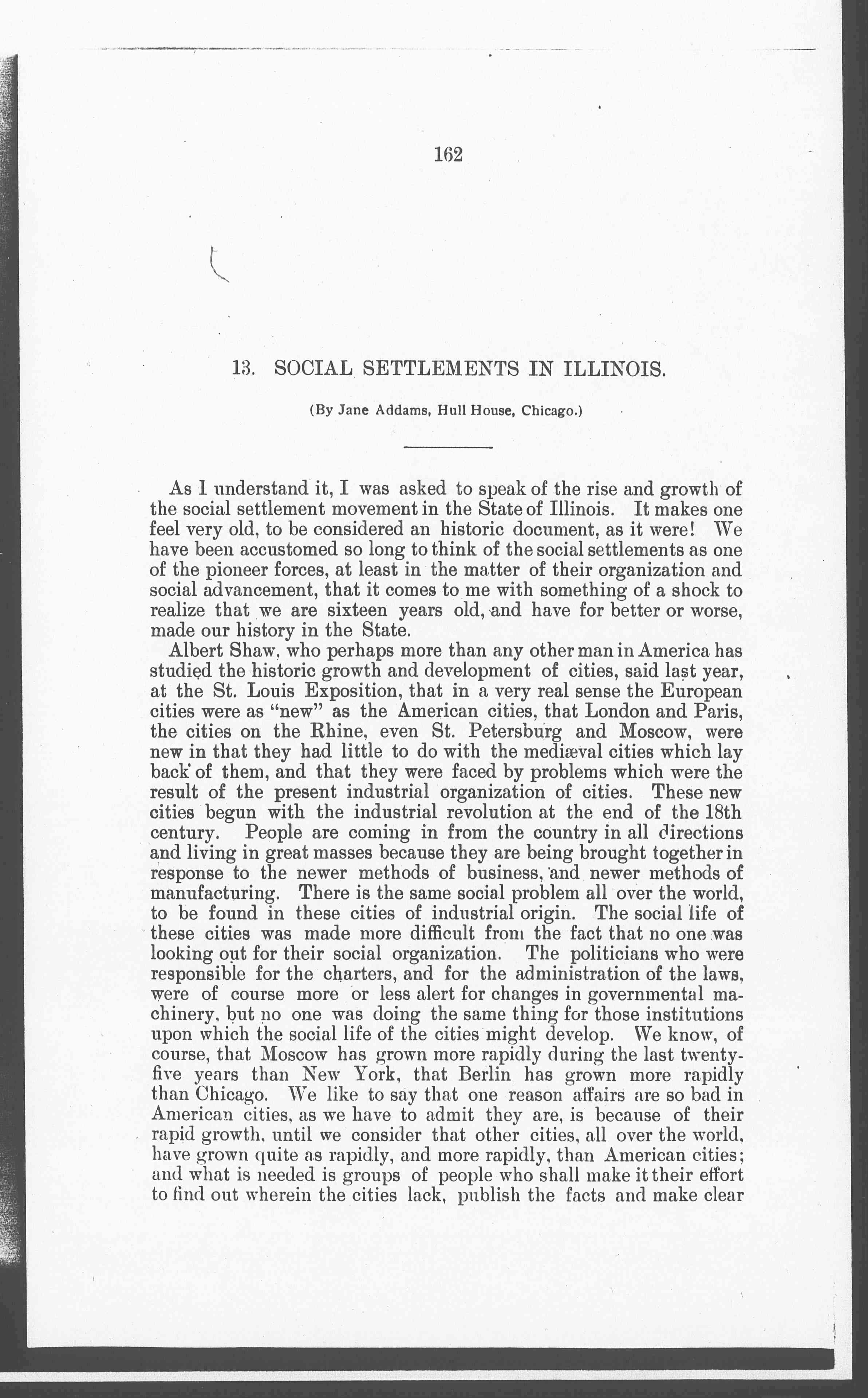 As I understand it, I was asked to speak of the rise and growth of the social settlement movement in the State of Illinois. It makes one feel very old, to be considered an historic document, as it were! We have been accustomed so long to think of the social settlements as one of the pioneer forces, at least in the matter of their organization and social advancement, that it comes to me with something of a shock to realize that we are sixteen years old, and have for better or worse, made our history in the State.