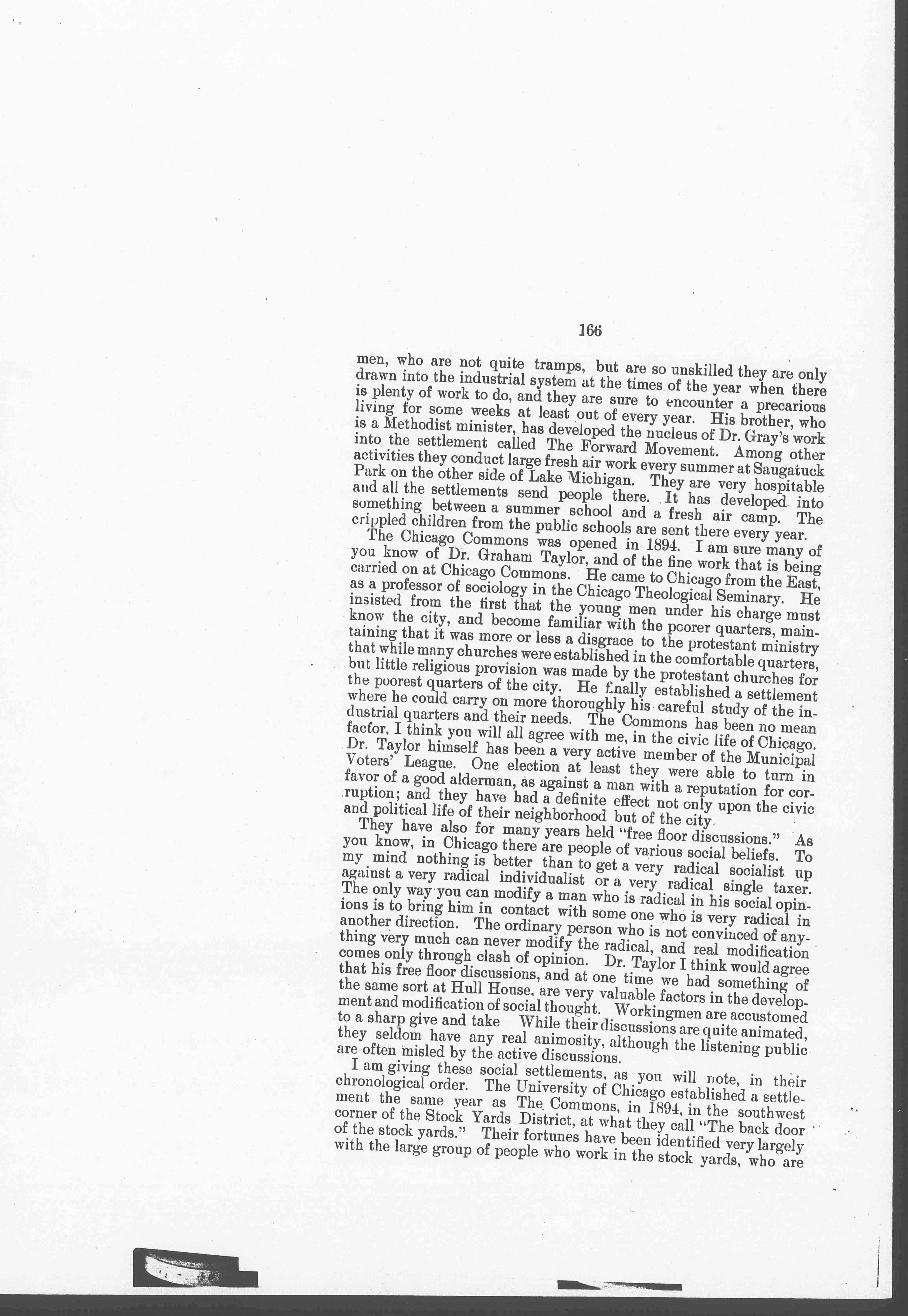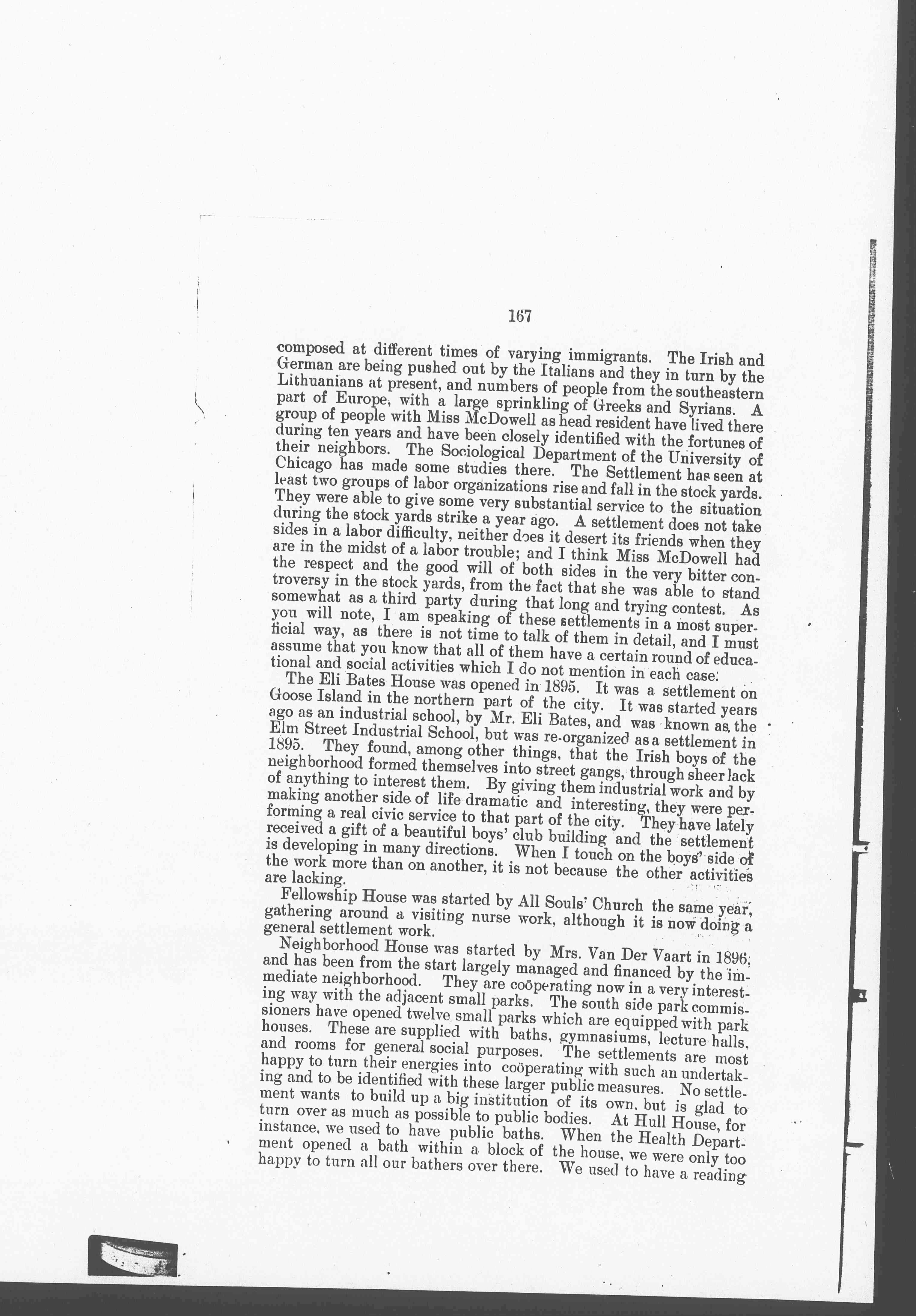 I am giving these social settlements, as you will note, in their chronological order. The University of Chicago established a settlement the same year as The Commons, in 1894, in the southwest corner of the Stock Yards District, at what they call "The back door of the stock yards." Their fortunes have been identified very largely with the large group of people who work in the stock yards, who are [page 7] composed at different times of varying immigrants. The Irish and German are being pushed out by the Italians and they in turn by the Lithuanians at present, and numbers of people from the southeastern part of Europe, with a large sprinkling of Greeks and Syrians. A group of people with Miss McDowell as head resident have lived there during ten years and have been closely identified with the fortunes of their neighbors. The Sociological Department of the University of Chicago has made some studies there. The Settlement has seen at least two groups of labor organizations rise and fall in the stock yards. They were able to give some very substantial service to the situation during the stock yards strike a year ago. A settlement does not take sides in a labor difficulty, neither does it desert its friends when they are in the midst of a labor trouble; and I think Miss McDowell had the respect and the good will of both sides in the very bitter controversy in the stock yards, from the fact that she was able to stand somewhat as a third party during that long and trying contest. As you will note, I am speaking of these settlements in a most superficial way, as there is not time to talk of them in detail, and I must asume that you know that all of them have a certain round of educational and social activities which I do not mention in each case.