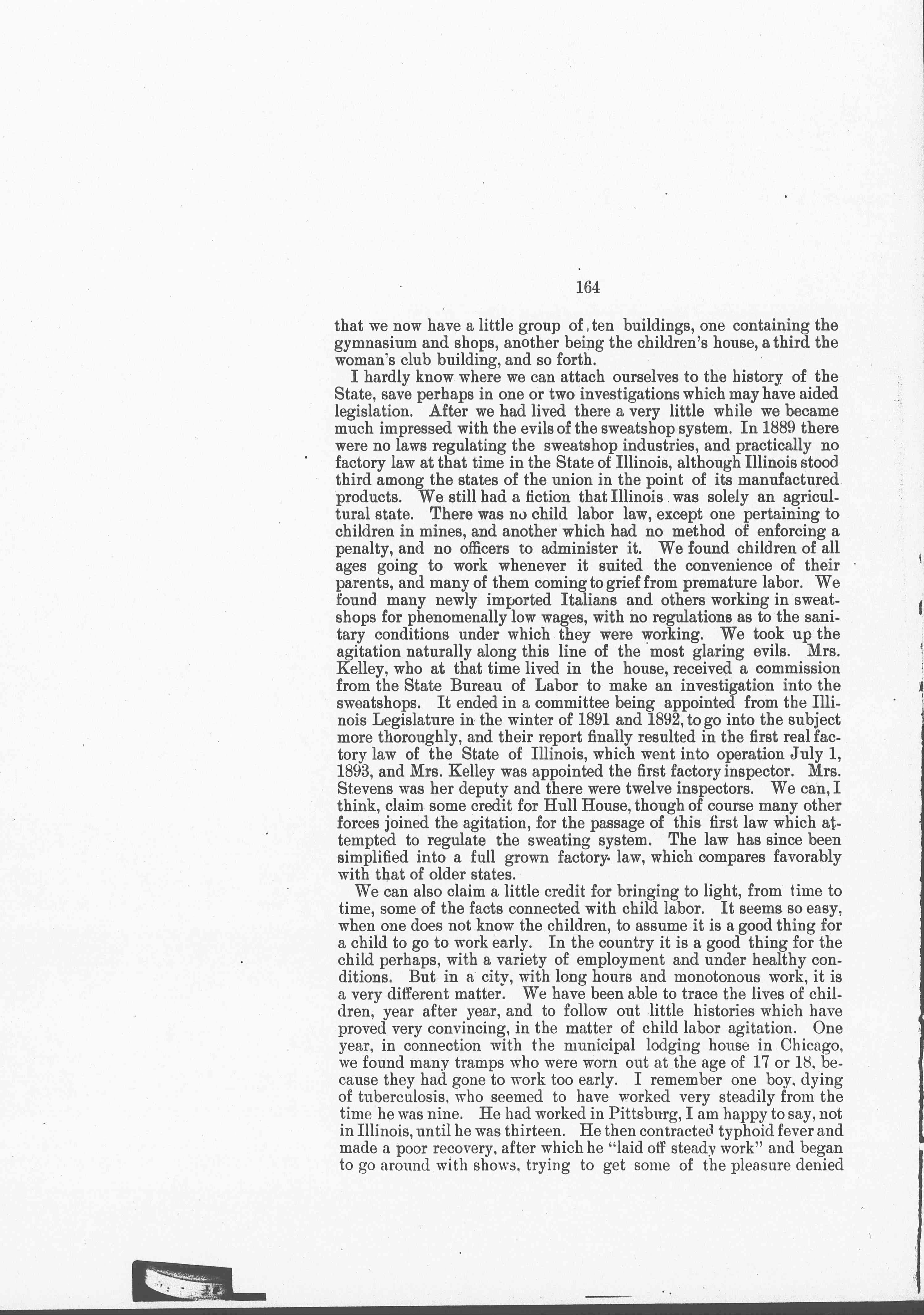 We can also claim a little credit for bringing to light, from time to time, some of the facts connected with child labor. It seems so easy, when one does not know the children, to assume it is a good thing for the child to go to work early. In the country it is a good thing for the child perhaps, with a variety of employment and under healthy conditions. But in a city, with long hours and monotonous work, it is a very different matter. We have been able to trace the lives of children, year after year, and to follow out little histories which have proved very convincing, in the matter of child labor agitation. One year, in connection with the municipal lodging house in Chicago, we found many tramps who were worn out at the age of 17 or 18, because they had gone to work too early. I remember one boy, dying of tuberculosis, who seemed to have worked very steadily from the time he was nine. He had worked in [Pittsburgh], I am happy to say, not in Illinois, until he was thirteen. He then contracted typhoid fever and made a poor recovery, after which he "laid off steady work" and began to go around with shows, trying to get some of the pleasure denied [page 5] him in young boyhood. He could not endure this sort of life long, and he died with tuberculosis at the age of seventeen. That sort of history can be duplicated over and over again if one follows the children who take the strength which should go into growth and put it into premature labor. I instance these things to show the service a settlement may perform in the way of getting accurate information in regard to its neighbors.