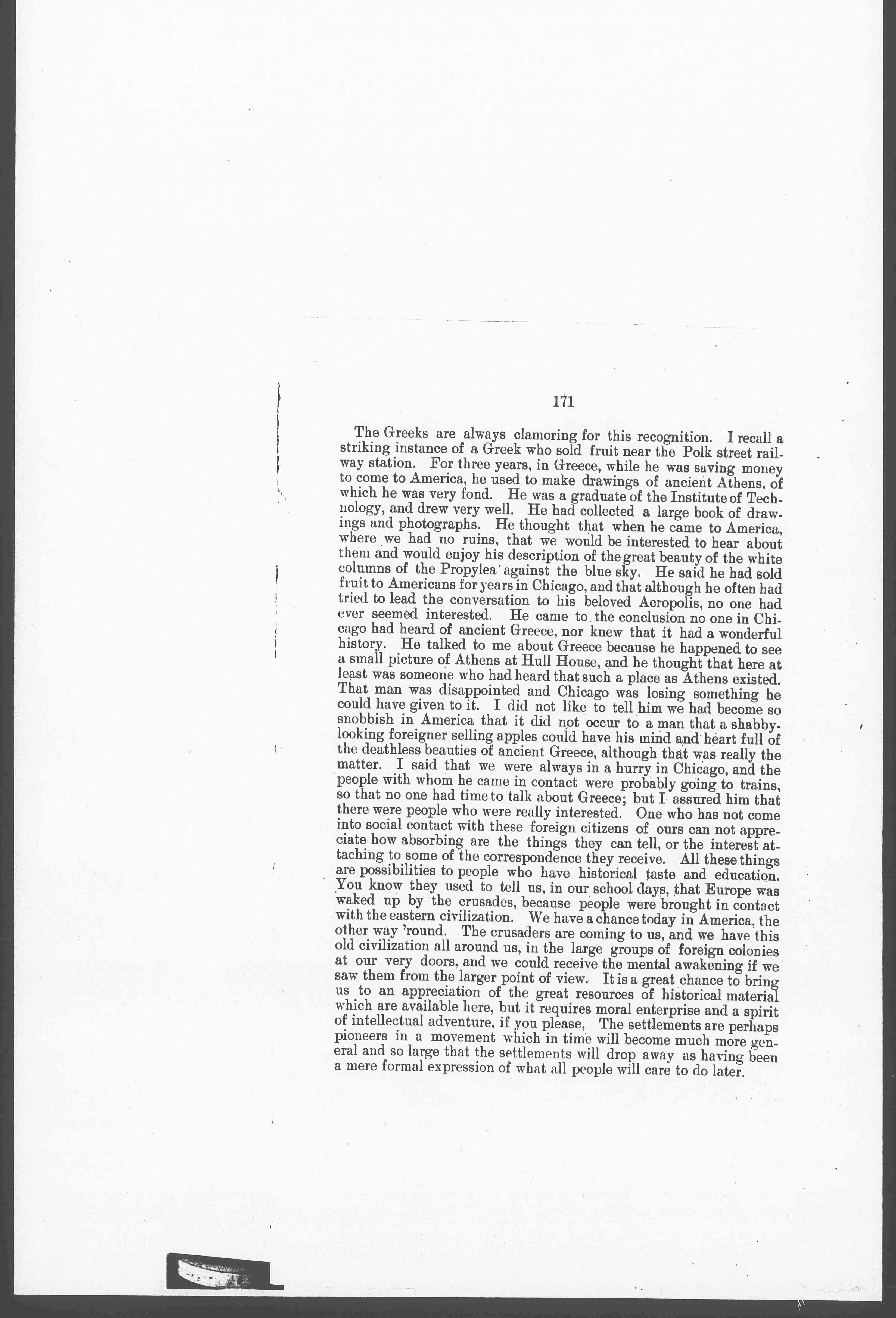 The Greeks are always clamoring for this recognition. I recall a striking instance of a Greek who sold fruit near the Polk street railway station. For three years, in Greece, while he was saving money to come to America, he used to make drawings of ancient Athens, of which he was very fond. He was a graduate of the Institute of Technology, and drew very well. He had collected a large book of drawings and photographs. He thought that when he came to America, where we had no ruins, that we would be interested to hear about them and would enjoy his description of the great beauty of the white columns of the Propylea against the blue sky. He said he had sold fruit to Americans for years in Chicago, and that although he often had tried to lead the conversation to his beloved Acropolis, no one had ever seemed interested. He came to the conclusion no one in Chicago had heard of ancient Greece, nor knew that it had a wonderful history. He talked to me about Greece because he happened to see a small picture of Athens at Hull House, and he thought that here at least was someone who had heard that such a place as Athens existed. That man was disappointed and Chicago was losing something he could have given to it. I did not like to tell him we had become so snobbish in America, that it did not occur to a man that a shabby-looking foreigner selling apples could have his mind and heart full of the deathless beauties of ancient Greece, although that was really the matter. I said that we were always in a hurry in Chicago, and the people with whom he came in contact were probably going to trains, so that no one had time to talk about Greece; but I assured him that there were people who were really interested. One who has not come into social contact with these foreign citizens of ours ca not appreciate how absorbing are the things they can tell, or the interest attaching to some of the correspondence they receive. All these things are possibilies to people who have historical taste and education. You know they used to tell us, in our school days, that Europe was waked up by the crusades, because people were brought in contact with the eastern civilization. We have a chance today in America, the other way 'round. The crusaders are coming to us, and we have this old civilization all around us, in the large groups of foreign colonies at our very doors, and we could receive the mental awakening if we saw them from the larger point of view. It is a great chance to bring us to an appreciation of the great resources of historical material which are available here, but it requires moral enterprise and a spirit of intellectual adventure, if you please. The settlements are perhaps pioneers in a movement which in time will become much more general and so large that the settlements will drop away as having been a mere formal expression of what all people will care to do later.
