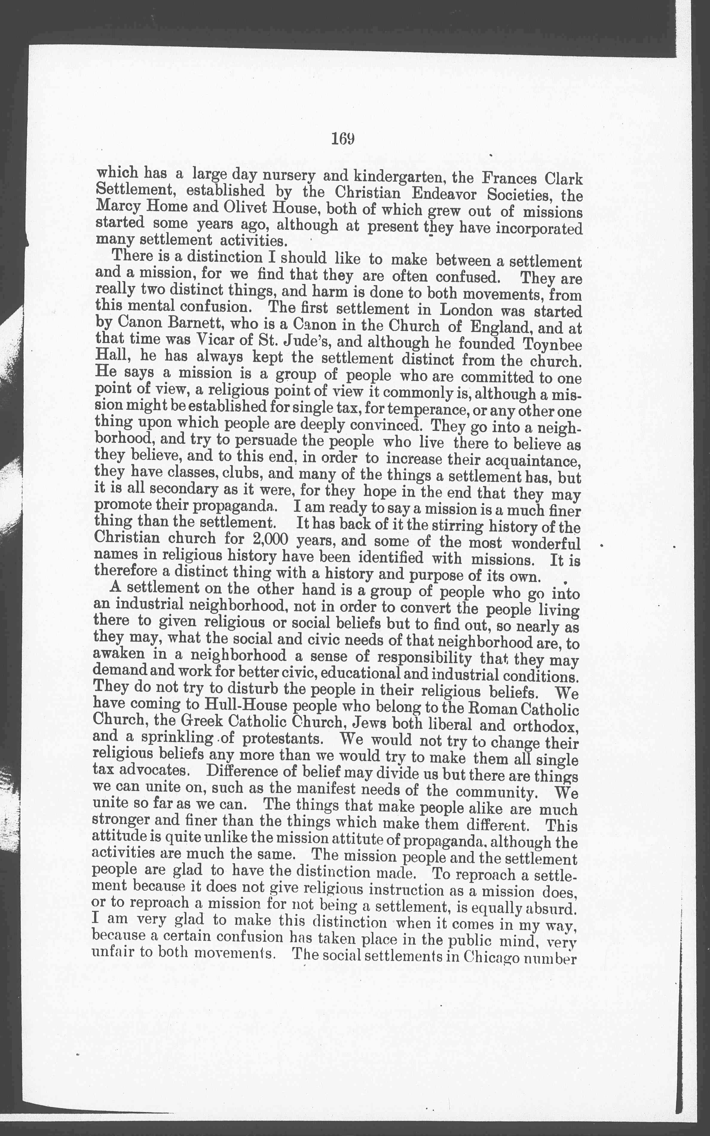 There are six other establishments in Chicago which call themselves settlements, although some of them might better be classed a missions. I put in this classification, the Central Settlement, under the auspices of the Paulist Fathers, the Frances Willard Settlement, [page 9] which has a large day nursery and kindergarten, the [Francis] Clark Settlement, established by the Christian Endeavor Societies, the Marcy Home and Olivet House, both of which grew out of missions started some years ago, although at present they have incorporated many settlement activities.
