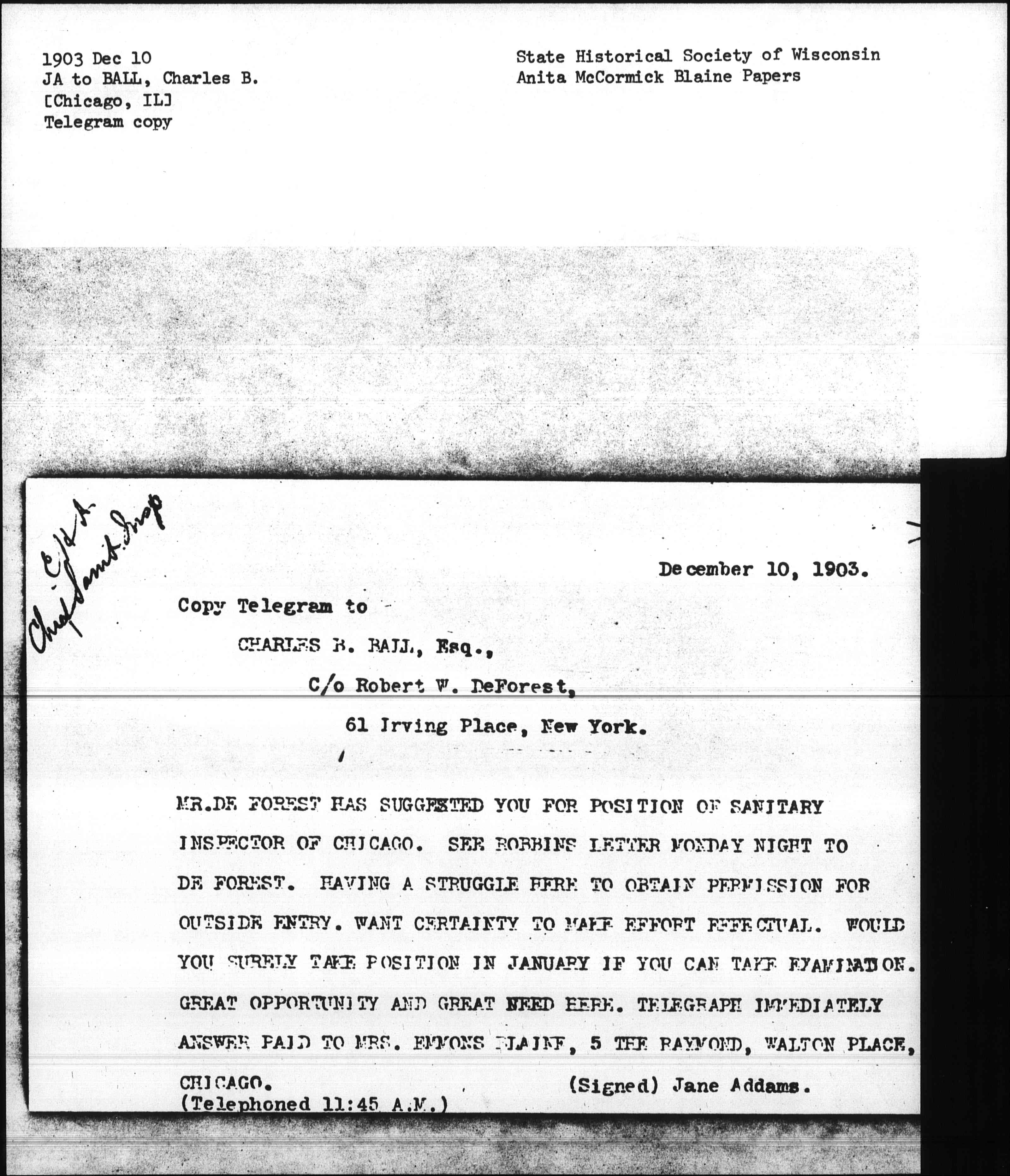 MR. DEFOREST HAS SUGGESTED YOU FOR POSITION OF SANITARY INSPECTOR OF CHICAGO. SEE [ROBINS] LETTER MONDAY NIGHT TO DEFOREST. HAVING A STRUGGLE HERE TO OBTAIN PERMISSION FOR OUTSIDE ENTRY. WANT CERTAINTY TO MAKE EFFORT EFFECTUAL. WOULD YOU SURELY TAKE POSITION IN JANUARY IF YOU CAN TAKE EXAMINATION. GREAT OPPORTUNITY AND GREAT NEED HERE. TELEGRAPH IMMEDIATELY ANSWER PAID TO MRS. EMMONS BLAINE, 5 THE RAYMOND, WALTON PLACE, CHICAGO.