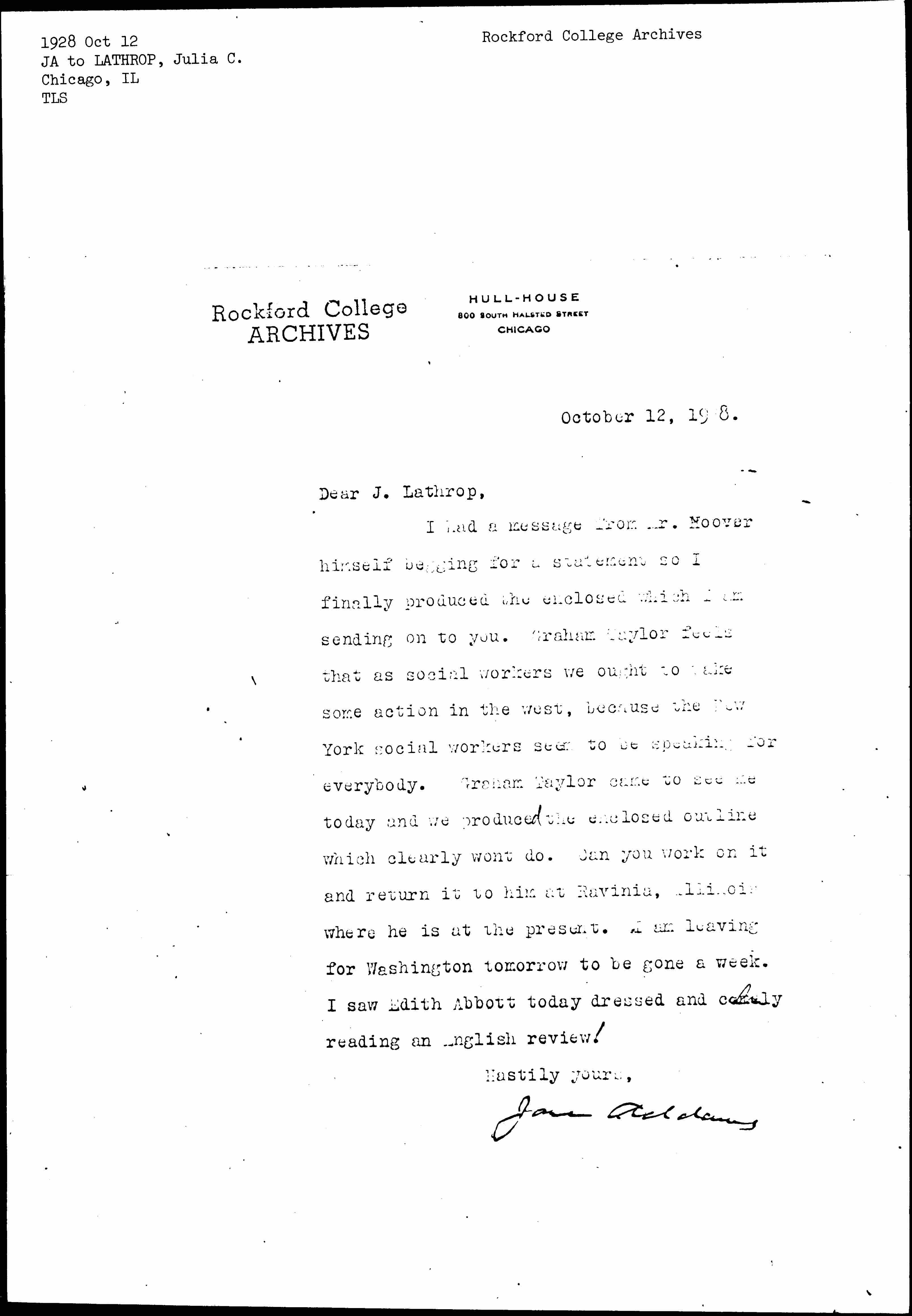 Jane Addams to Julia Clifford Lathrop, October 12, 1928