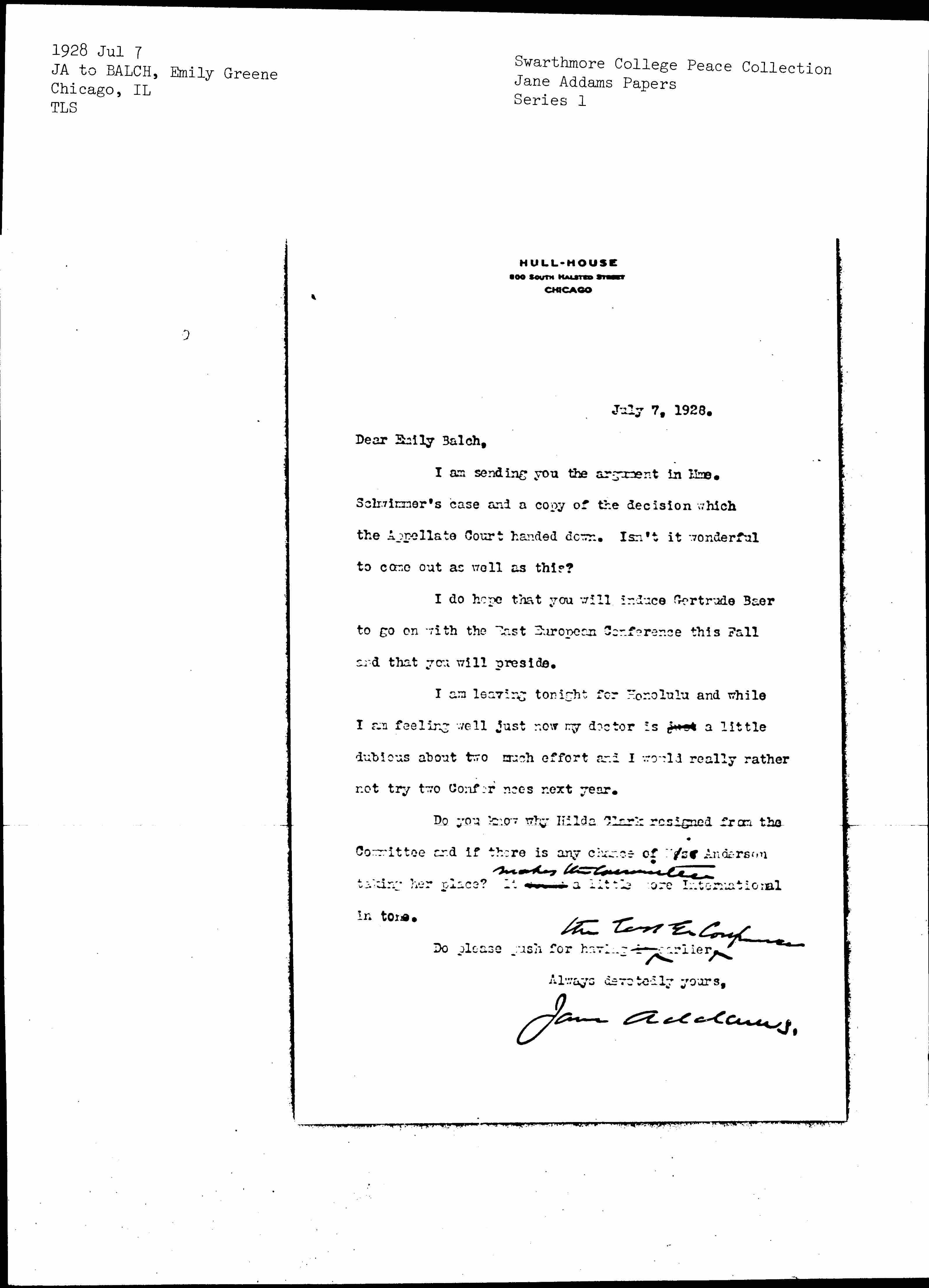 Jane Addams to Emily Greene Balch, July 7, 1928