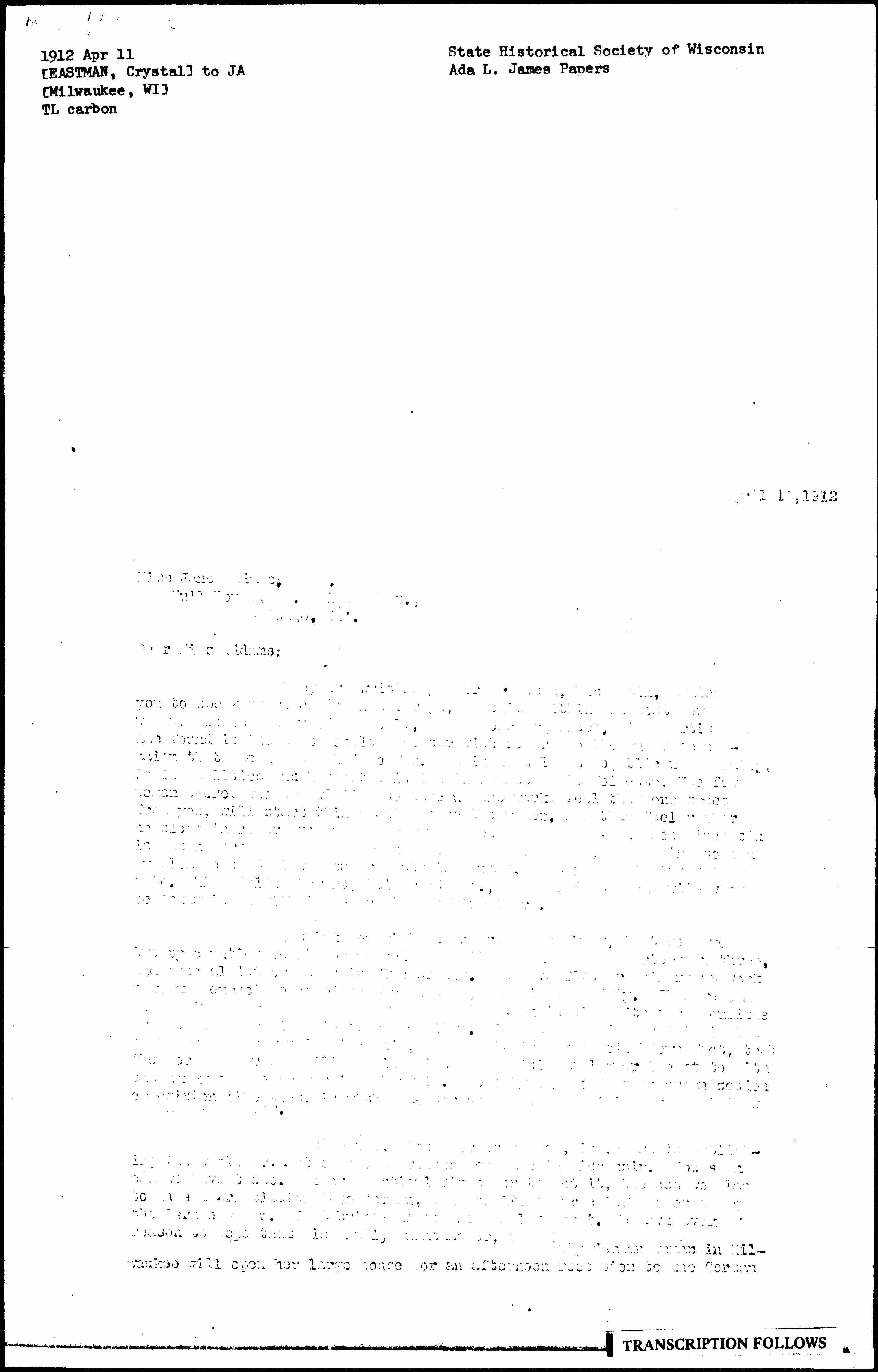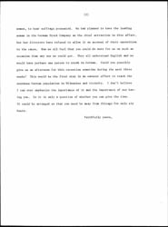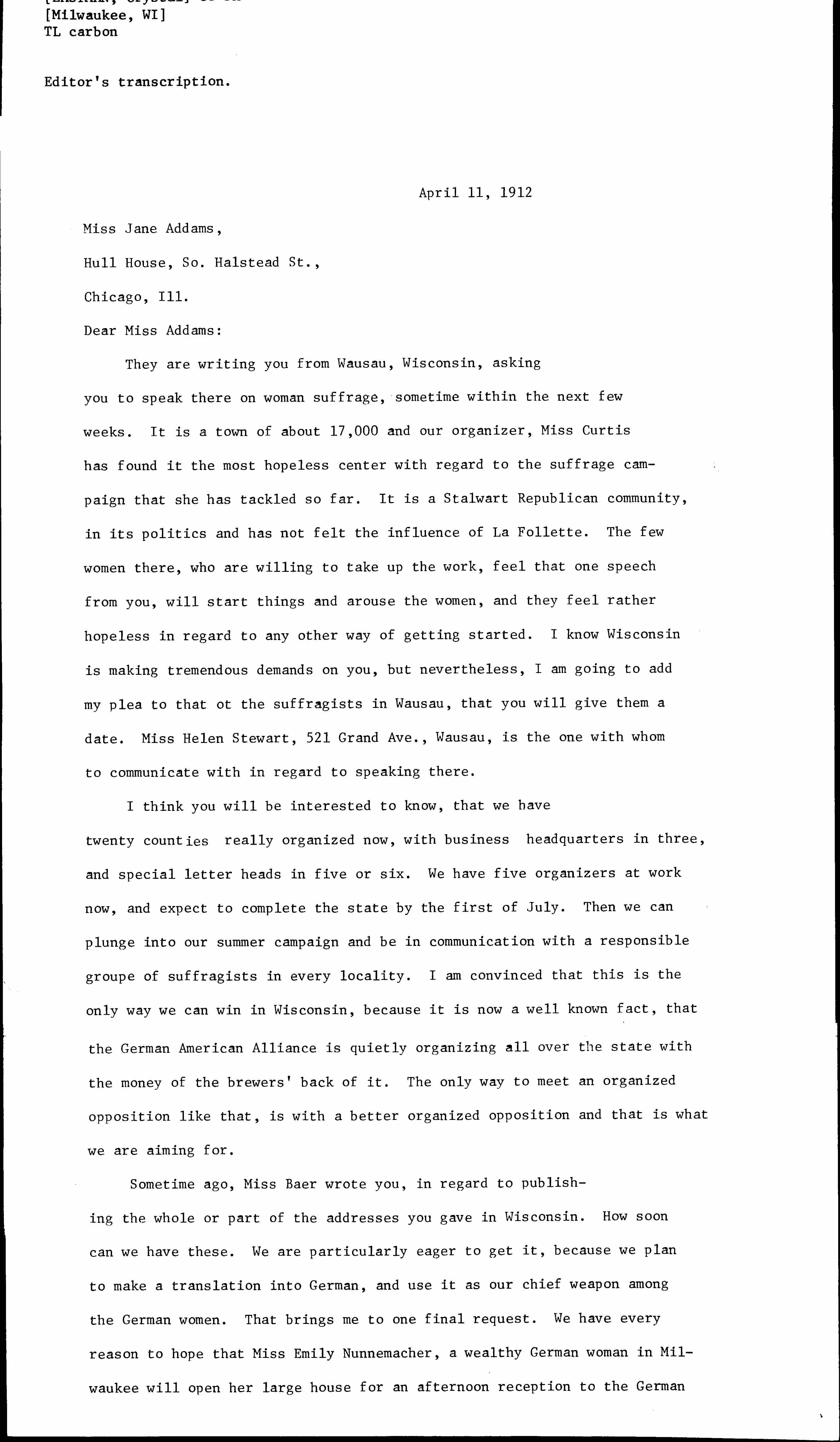 Sometime ago, Miss Baer wrote you, in regard to publishing the whole or part of the addresses you gave in Wisconsin. How soon can we have these. We are particularly eager to get it, because we plan to make a translation into German, and use it as our chief weapon among the German women. That brings me to one final request. We have every reason to hope that Miss Emily Nunnemacher, a wealthy German woman in Milwaukee will open her large house for an afternoon reception to the German [page 2] women, to hear suffrage presented. We had planned to have the leading woman in the German Stock Company as the chief attraction in this affair, but her directors have refused to allow it on account of their opposition to the cause. Now we all feel that you could do more for us on such an occasion than any one we could get. They all understand English and we would have perhaps one person to speak in German. Could you possibly give us an afternoon for this reception sometime during the next three weeks? This would be the first step in an earnest effort to reach the enormous German population in Milwaukee and vicinity. I don't believe I can over emphasize the importance of it and the importance of our having you. So it is only a question of whether you can give the time. It could be arranged so that you need be away from Chicago for only six hours.