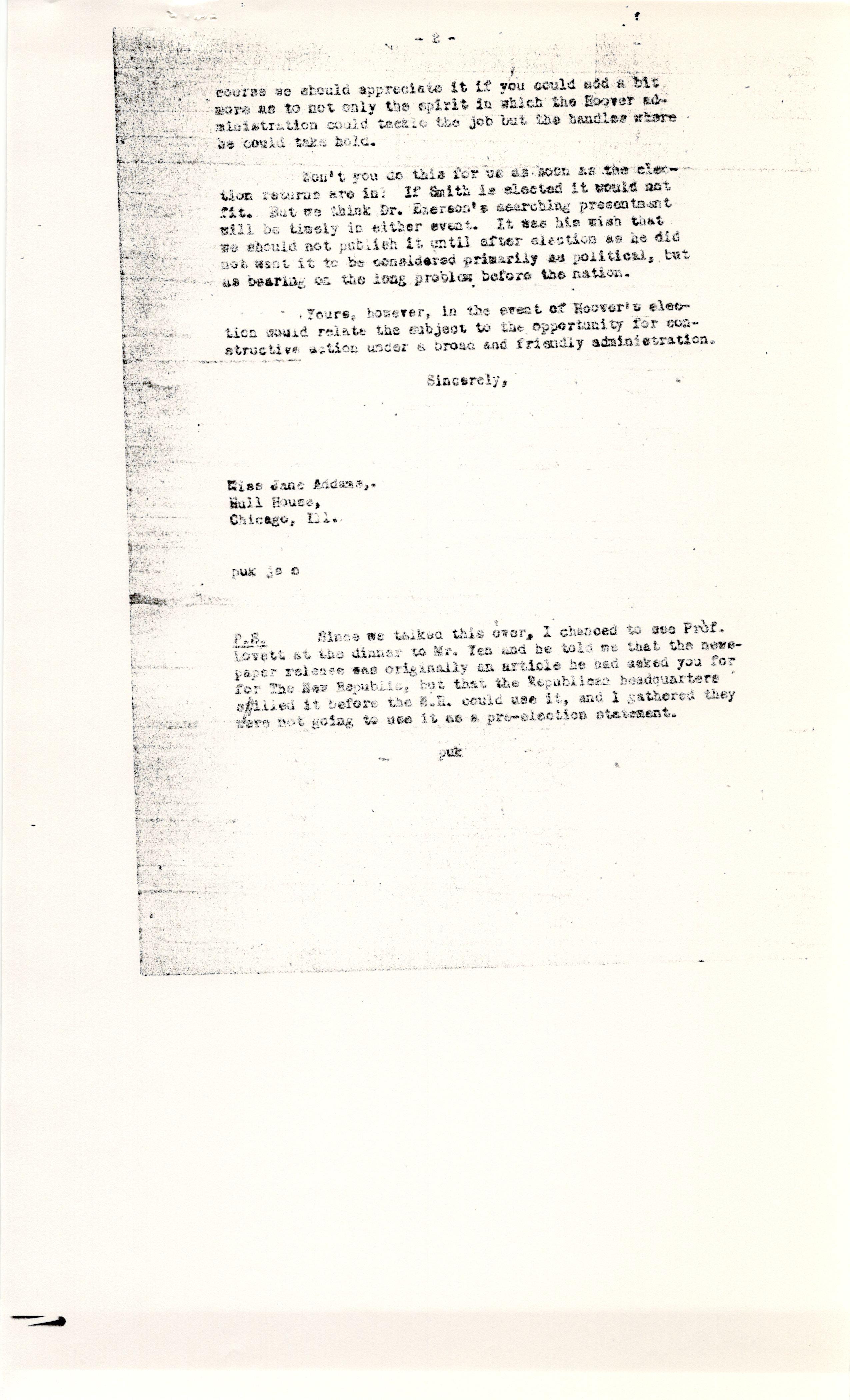 Jane Addams to Paul Underwood Kellogg, October 29, 1928