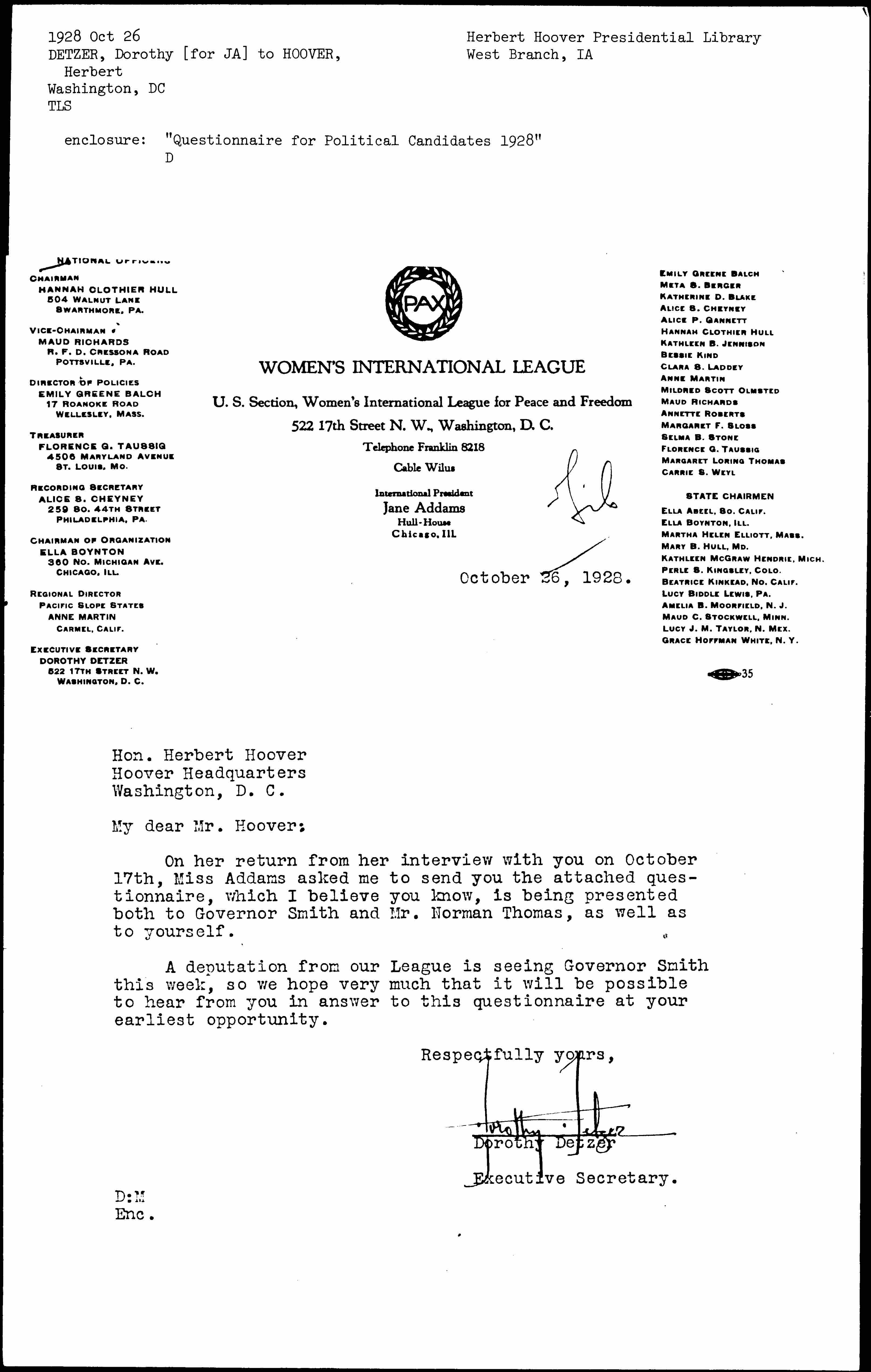 Dorothy Detzer to Herbert Clark Hoover, October 26, 1928